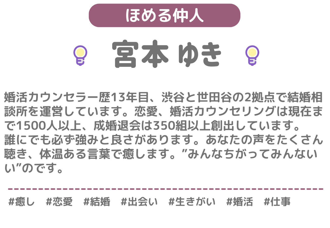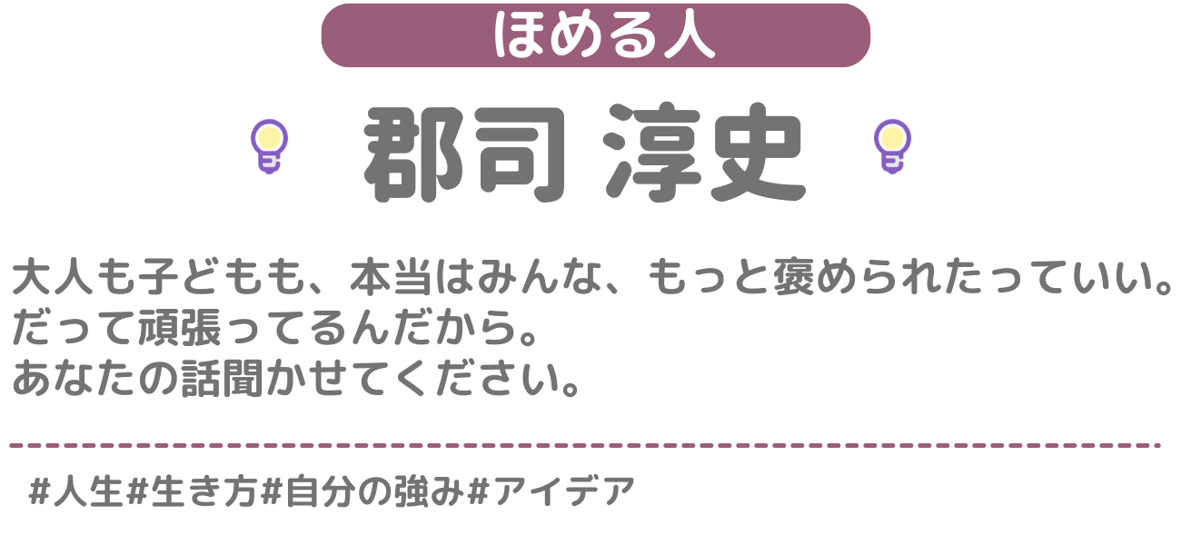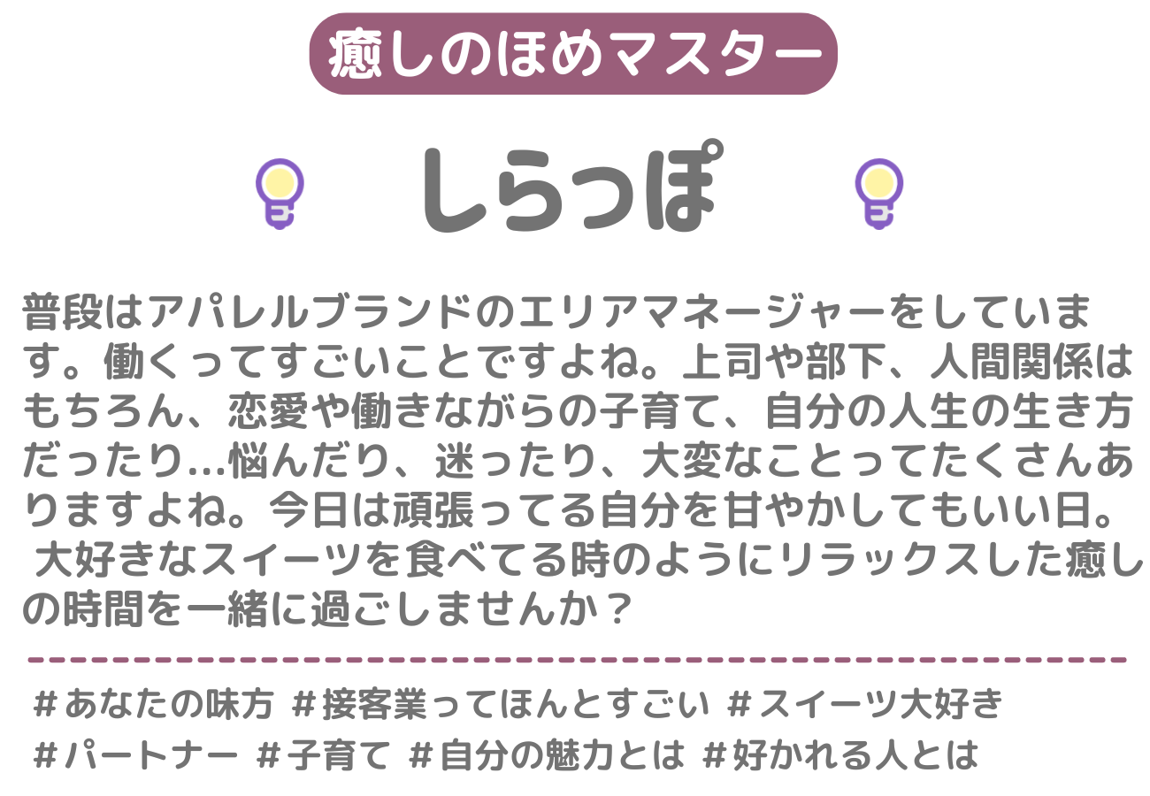 あなたの素敵だなと思ったところを、素直に褒めさせていただくお店です。「ほめる人」の中から1名を選んでご予約いただきます。当日は、その人があなたのお話しを聞きながら、褒めさせていただきます。何を話していいのか分からなくても大丈夫。まずは「ほめる人」との会話を楽しんでみてくださいね。