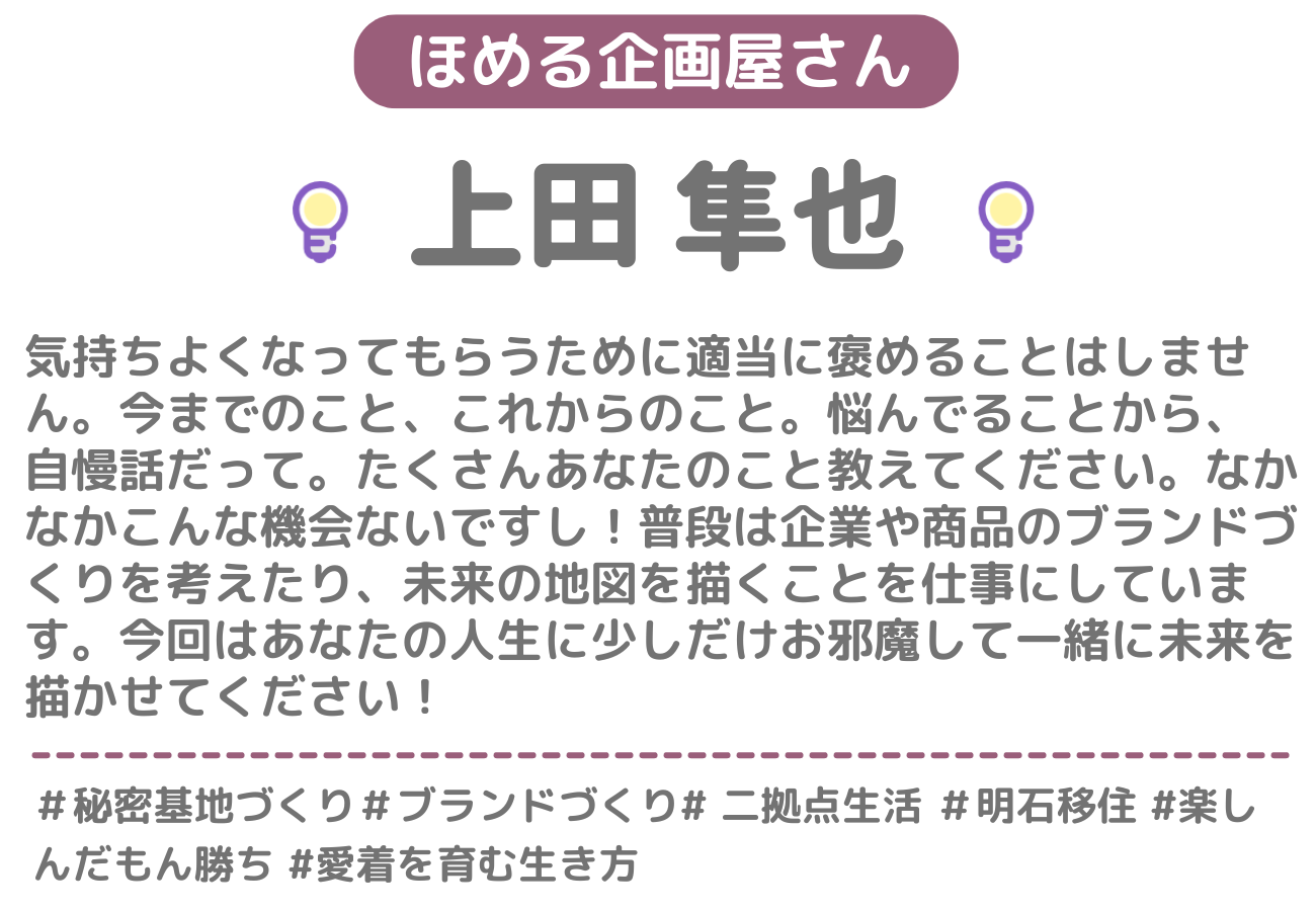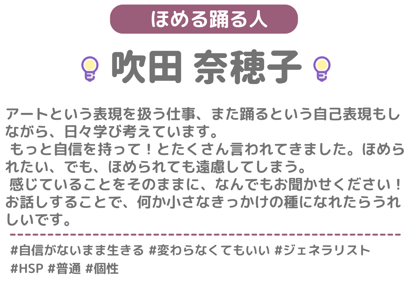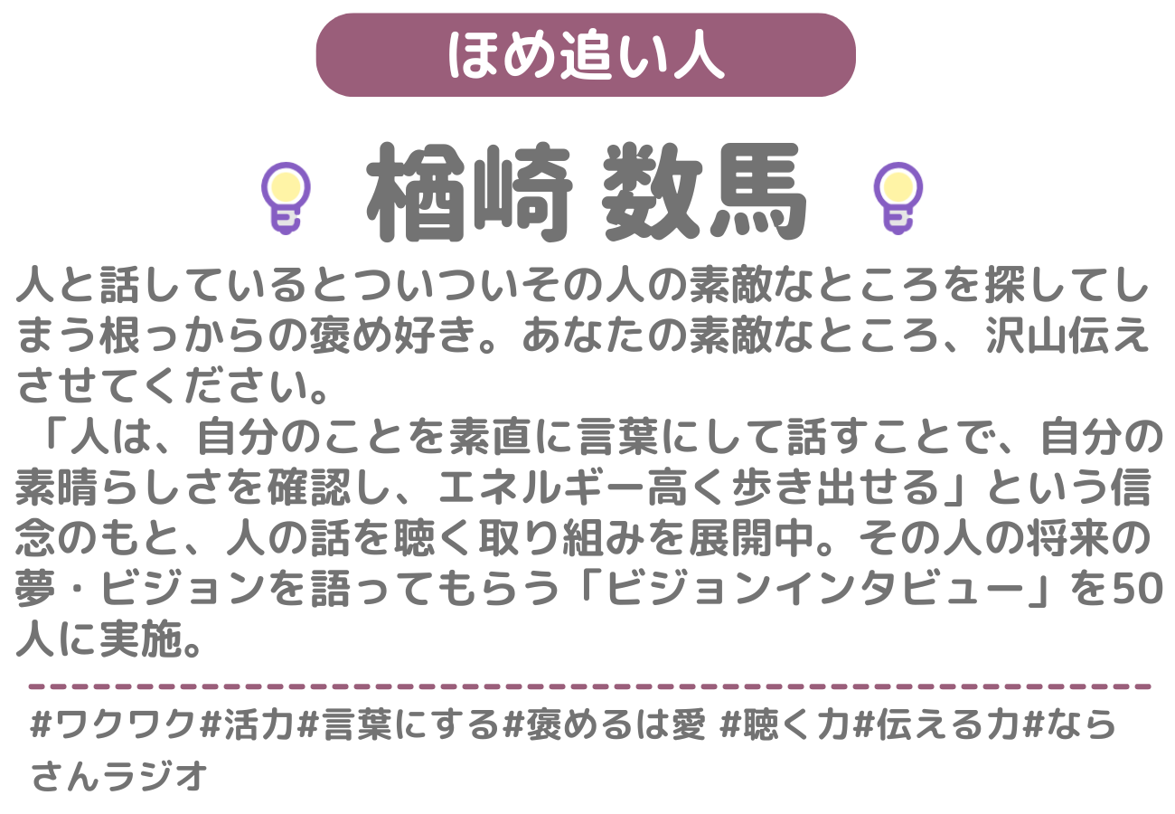 あなたの素敵だなと思ったところを、素直に褒めさせていただくお店です。「ほめる人」の中から1名を選んでご予約いただきます。当日は、その人があなたのお話しを聞きながら、褒めさせていただきます。何を話していいのか分からなくても大丈夫。まずは「ほめる人」との会話を楽しんでみてくださいね。