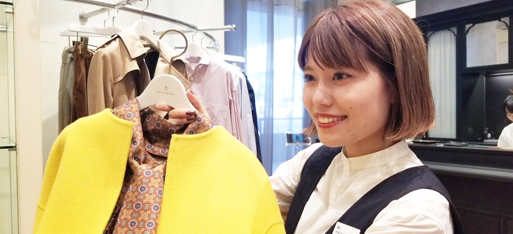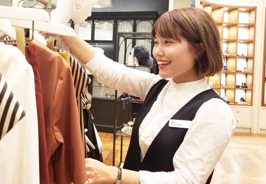 とても素敵な笑顔で、お客様も一緒に働くスタッフも笑顔にできる販売員です。彼女自身がファッションを日々楽しみ、洋服以外のアンテナを張っているので、実に多岐に渡る会話でお客様に洋服を買うという行為を通して付加価値のある時間を提供できます。そんな快活な一方で、自分の役割への責任感も非常に強く、接客以外の仕事でも、常に工夫を考えられる視点も兼ね備えている、とても頼もしい存在です。