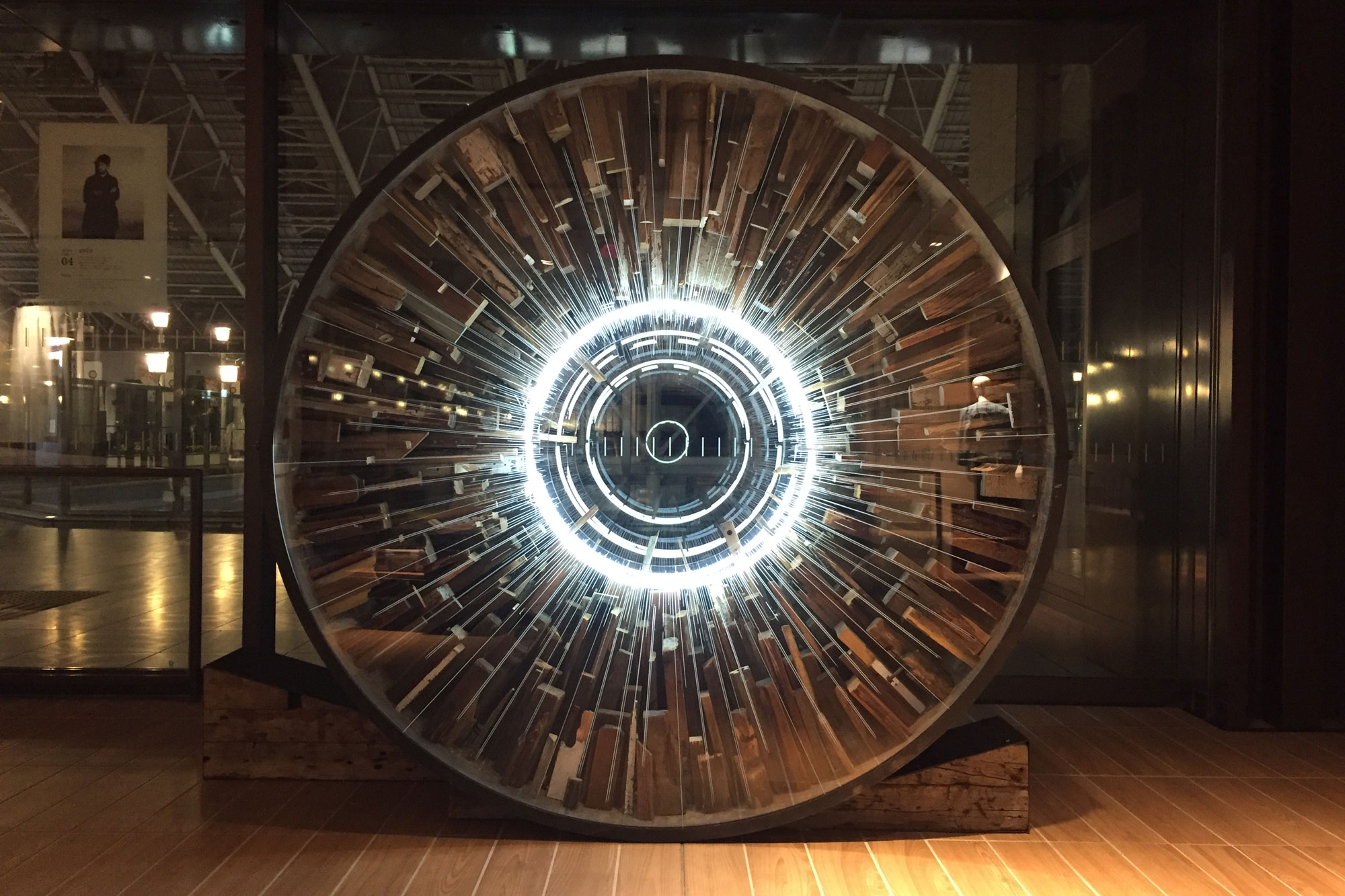 それらに比べてENZOの「EYE」は異質だった。その強度・純度は場をねじ曲げるほどで、でもその違和はその時間のなかでは妙に溶け合ったりもしている。瞳を連想させる形状をしたオブジェのなかには、世界中から集められた年代ものの木が立ち並んでいて、まるで街のようにも見えてくる。それは多様さを内包する街そのものであり、その風景を瞳が映し出しているようでもあり…。ふと我に返るとそこは多様な街=大阪の中心であるルクア大阪だったりするわけだ。