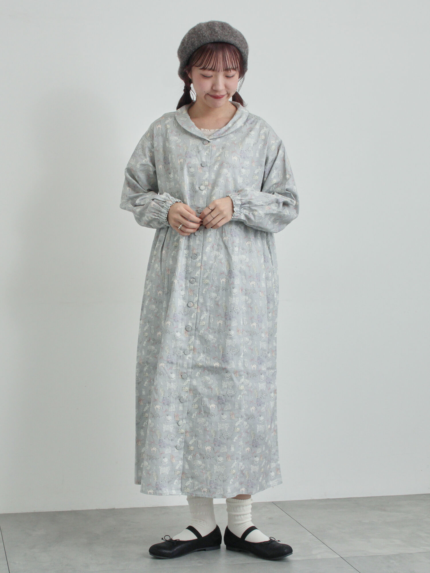 猫がたくさんのワンピースを着てみました🐈 大きめのボタンやコロンとした襟がとてもかわいいです♪ ウエストは斜めにギャザーがはいっているので 広がりすぎないシルエット☺︎