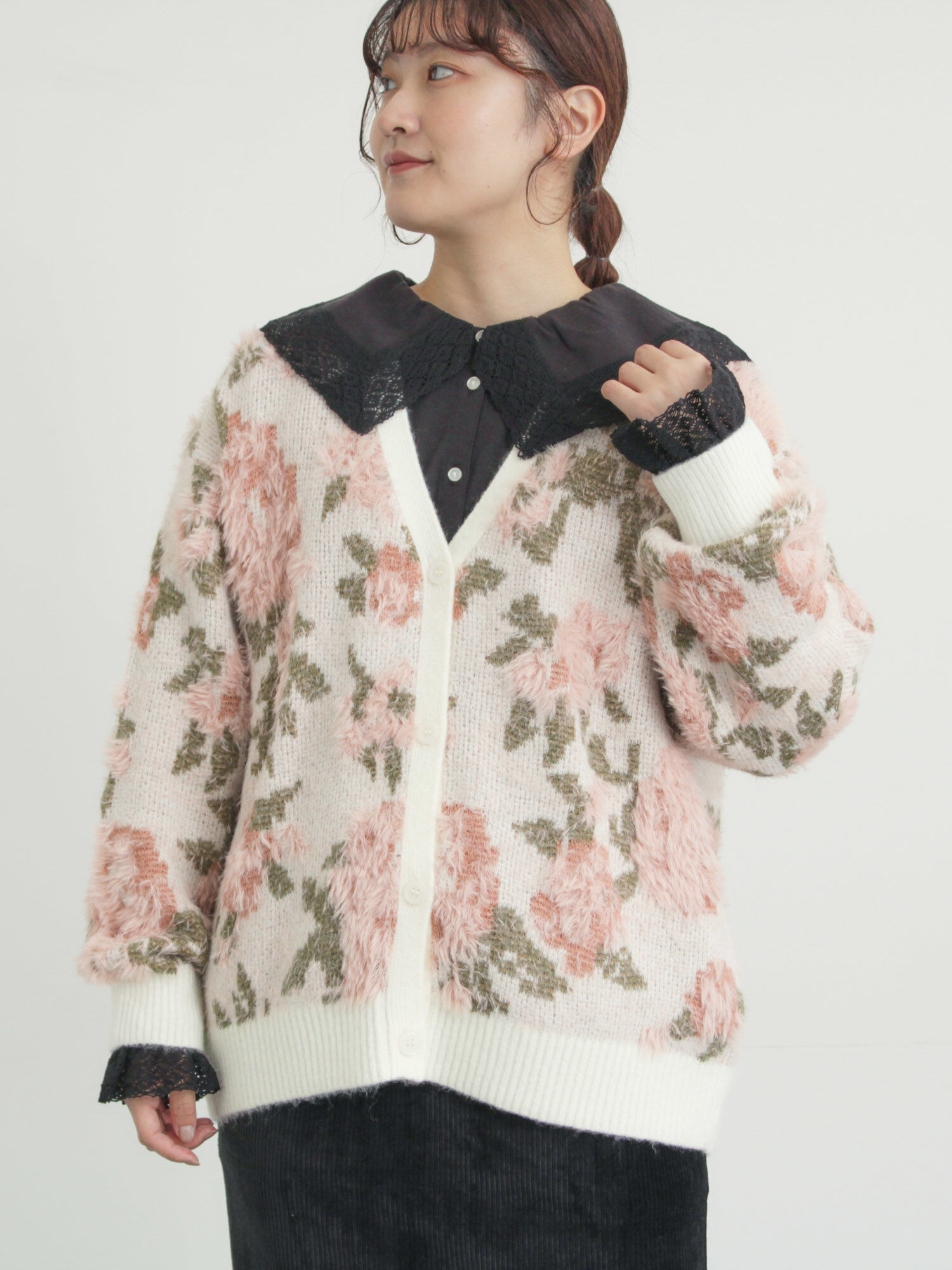 無地・花柄シャギーVネックカーディガン