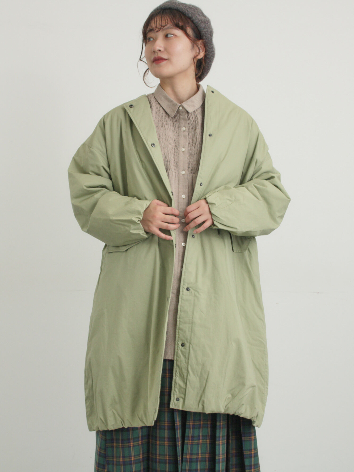 長さもしっかりある中綿コートです♪ 春先も着やすい明るめのカーキとなっております。