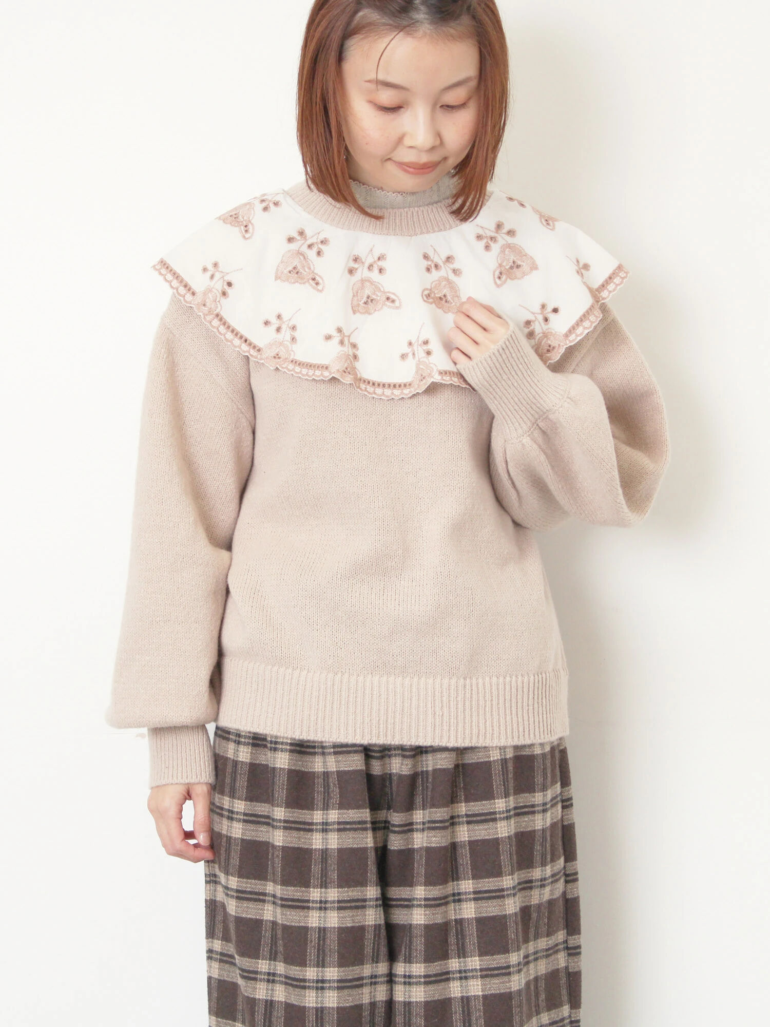 襟が可愛い前後着ニットを着てみました🌟 小物も淡いベージュでまとめてナチュラルなコーデに🙌 ニットのデザインが際立つ組み合わせになりました🥨