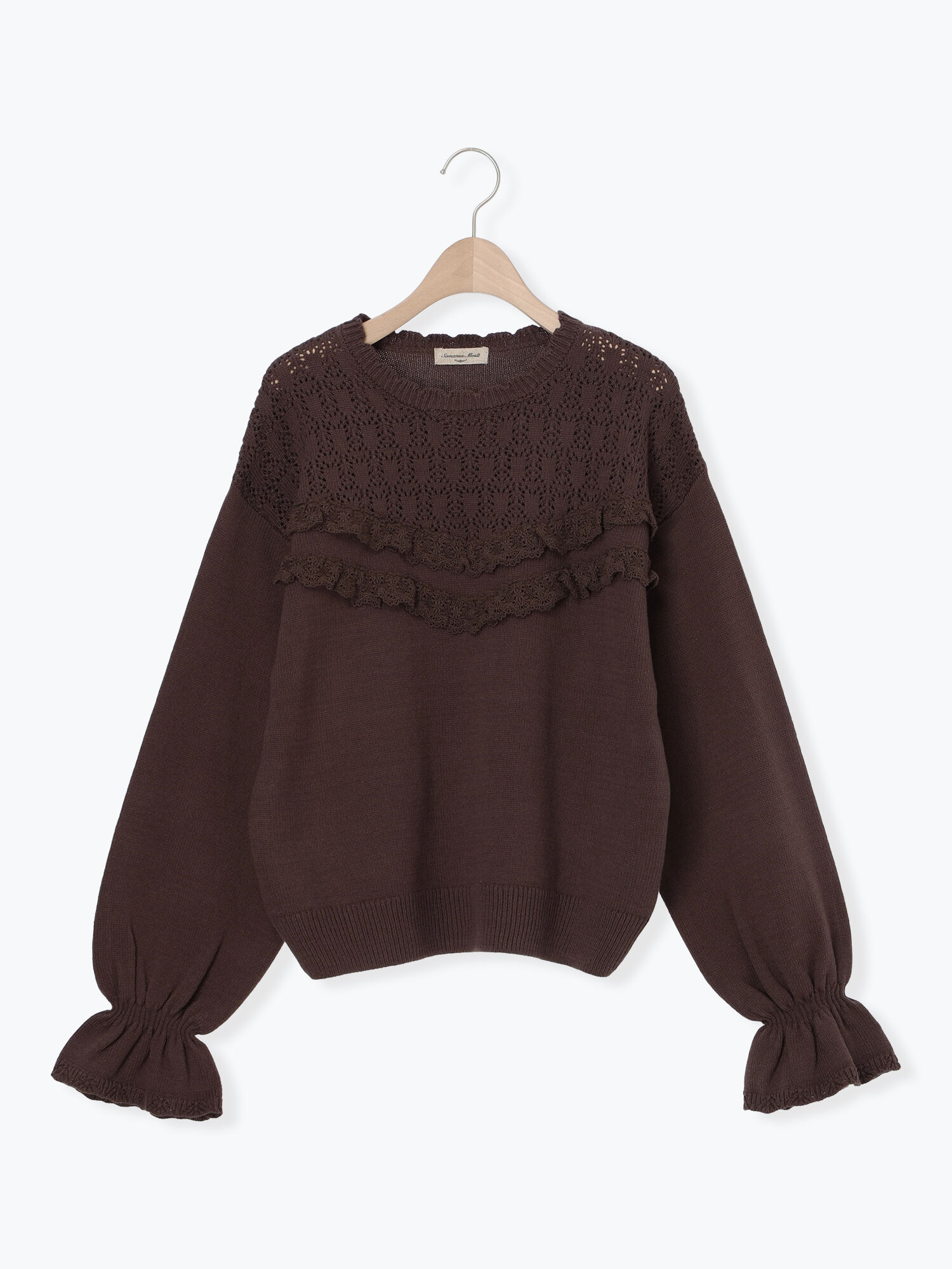 フリルとキャンディスリーブが可愛いニットにはティアードチュニックと襟付きインナーを合わせて甘い仕上がりに🥨 デニムも淡いお色でまとめてニットのお色が映えるようなコーデにしてみました☕️