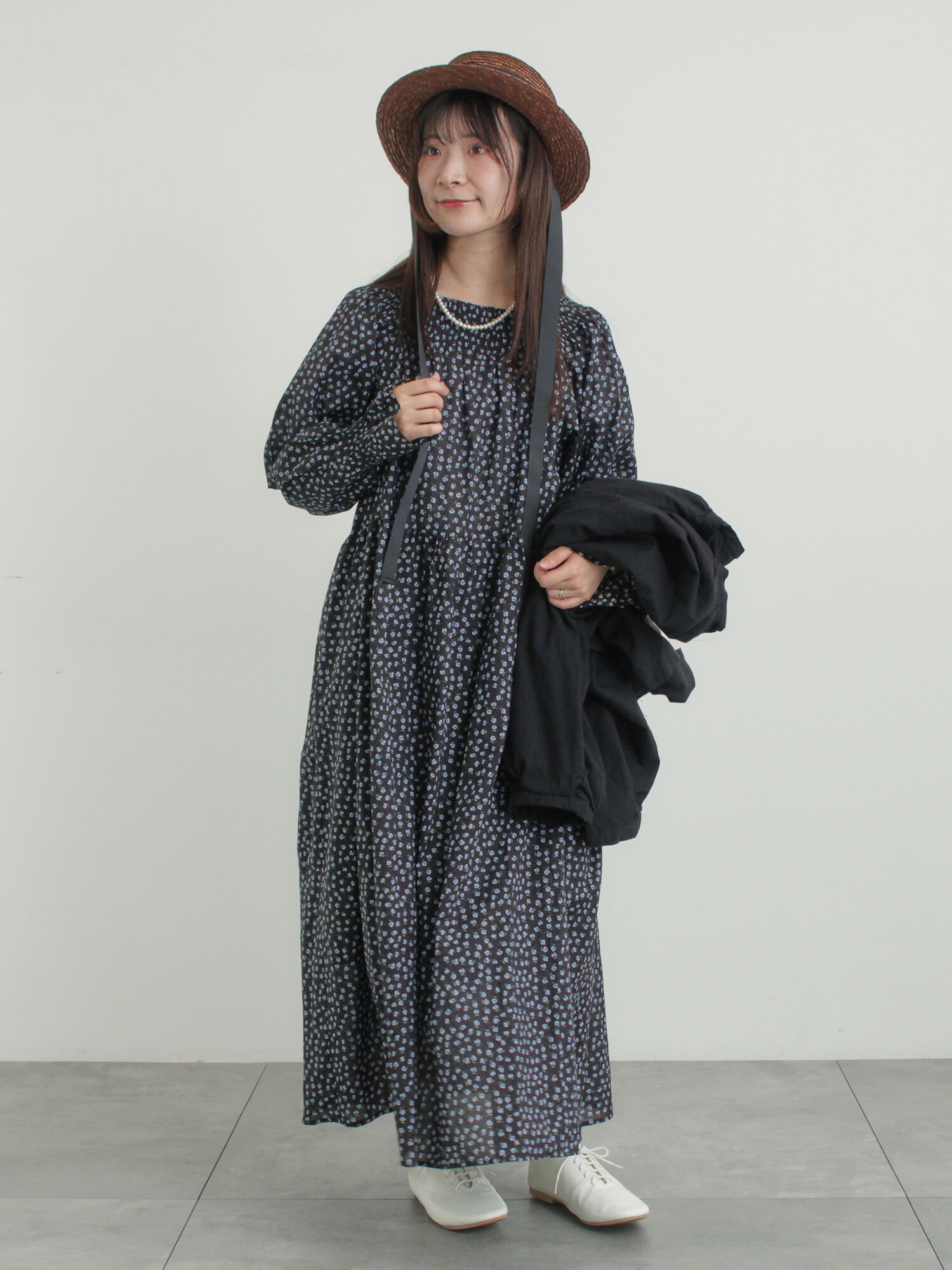 さらりとした綿のワンピースに デニムジャケットを合わせた春コーデ☘️ 小花柄がとてもかわいいワンピースです! スクエアネックで1枚だとデコルテを出して 女性らしい印象に。レースインナー重ね着で ガーリーな着こなしができます♫