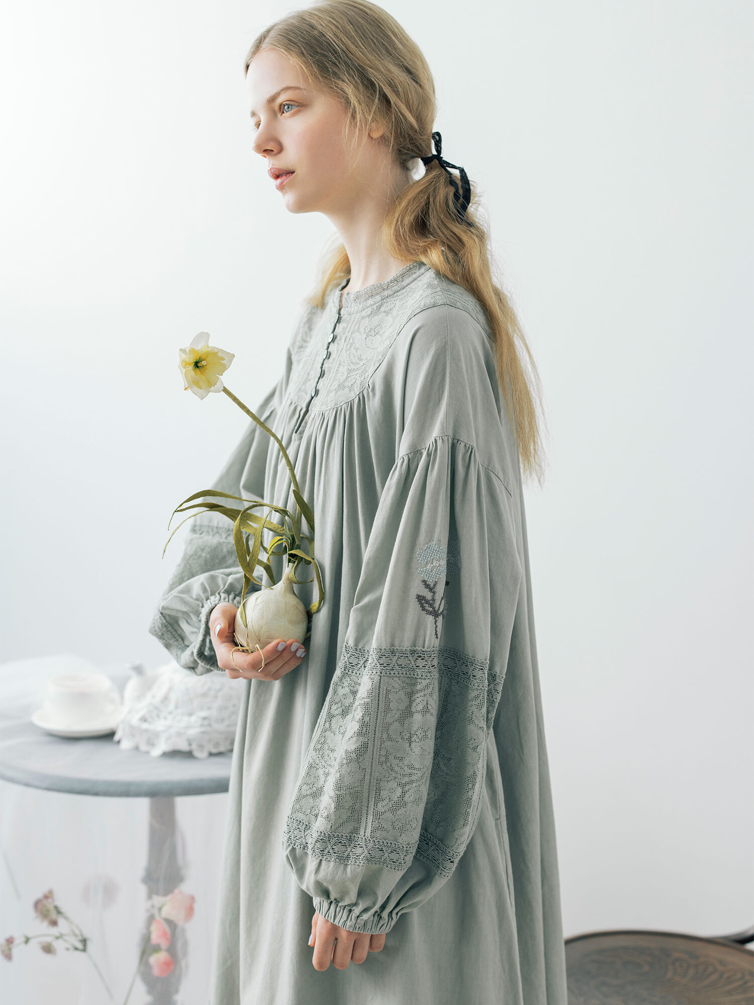 TSUHARUの新作ワンピースを着てみました♪ 胸元、袖、裾にあしらわれたレースが とても綺麗なワンピースです。 またクロスステッチも程よく 散りばめられているデザインなので 主張しすない程度の個性的な デザインになっています。 わたし的にふんわりとしたバルーンスリーブが とてもかわいいです♡
