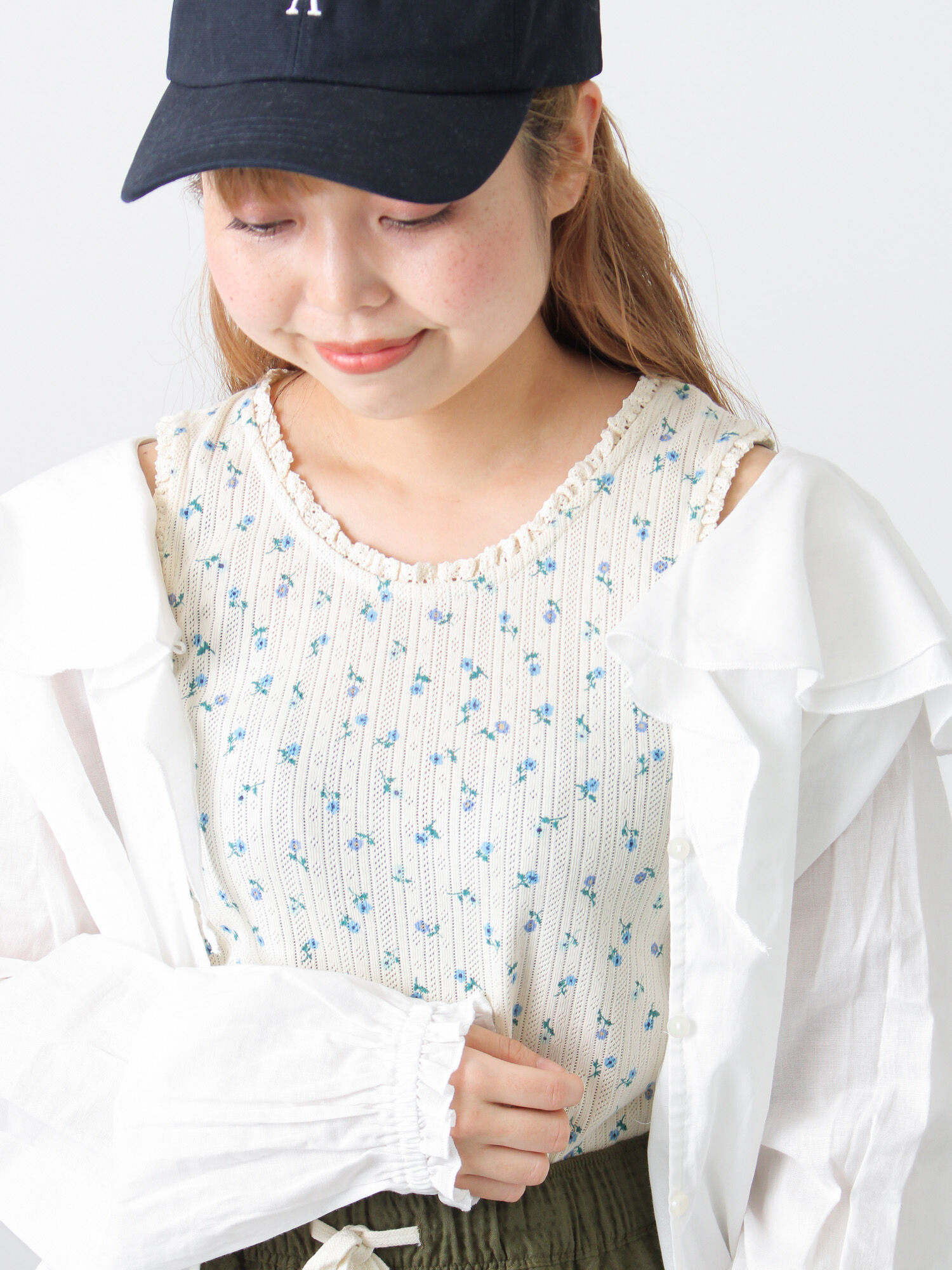 お花たっぷりのシンプルコーデ🪻 春らしくインナーとスカートにふんだんに お花柄を散りばめてみました☺︎ ですが、甘くなりすぎないように シアー素材のシャツを羽織って 少し大人な印象にしてみました♪