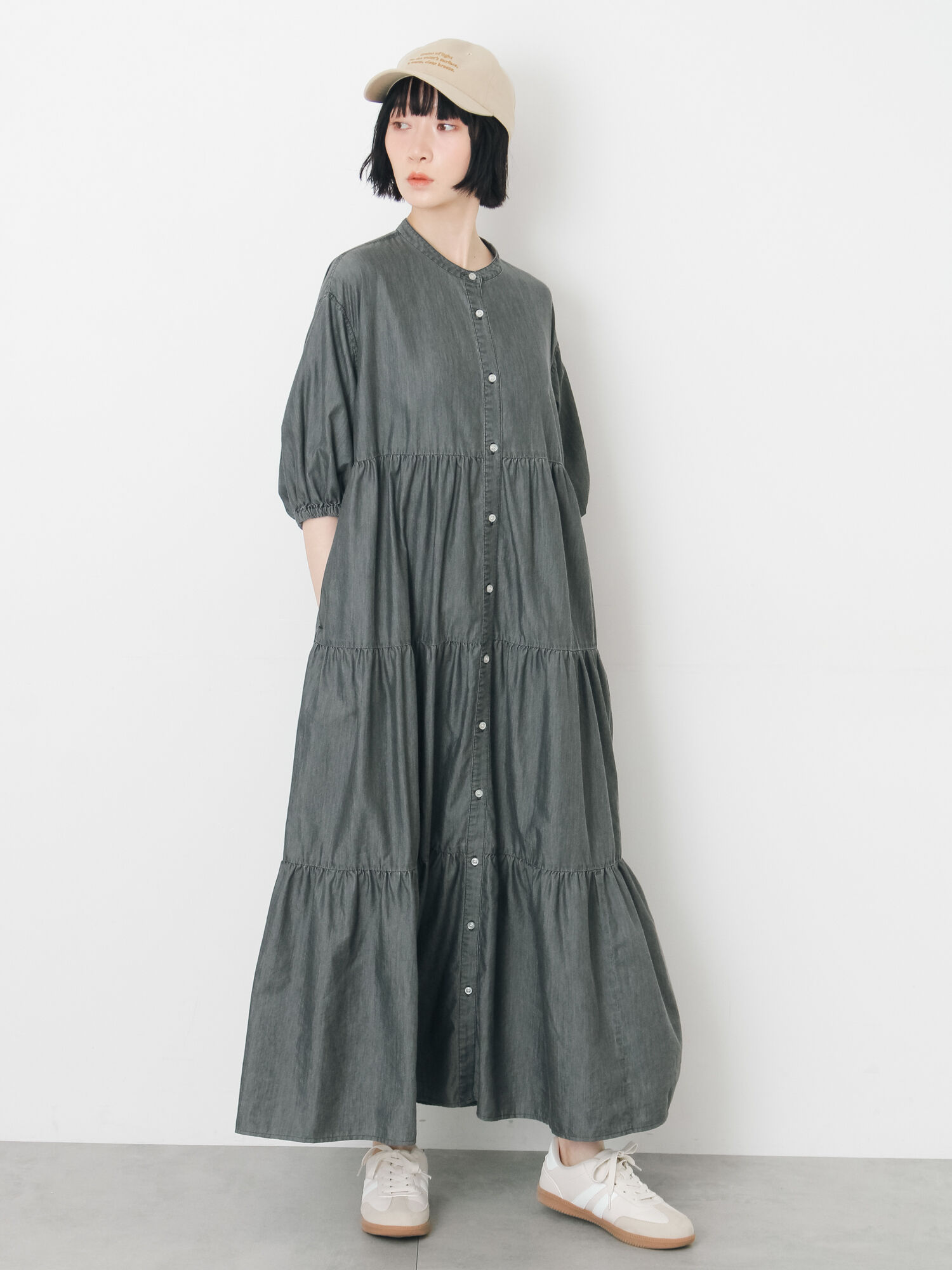 定番カジュアルコーデ🧢 デニムワンピースは羽織としてもきても◎ 着回し力抜群です👀ˎˊ˗