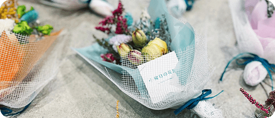 花束は特別な日の思い出を長く楽しんでいただけるようドライフラワーの花束となっています。