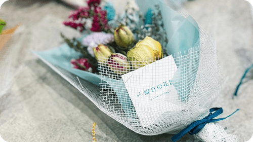 - 簡単な7個の質問にお答えいただき、それをもとにお話をしながら、あなた自身やあなたが想いを寄せる人のイメージにぴったりな花束を作るお店です。