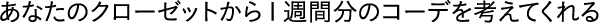 - スタイリストの中から担当を1人選び、ご予約いただきます。ご予約後、お悩みなどをお伺いするアンケートをお客様のメールアドレス宛にお送りいたしますので、事前に、アンケートのご回答と、ご自宅のクローゼットにあるお洋服(10アイテム程度)のお写真をお送りいただきます。その後、ご予約時間にご来店いただき、お話をさせていただきながら、頂いた写真たちを組み合わせ、コーディネートを1週間分ご提案させていただきます。