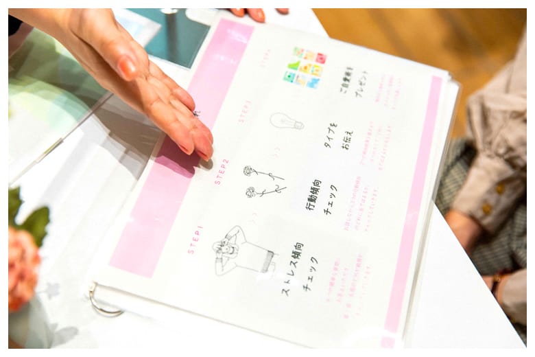 - お話を通じて、あなたのストレス傾向をチェックさせて頂きます。そして、その傾向から見えるあなたの才能と、あなたにぴったりのご自愛術をお伝えします。