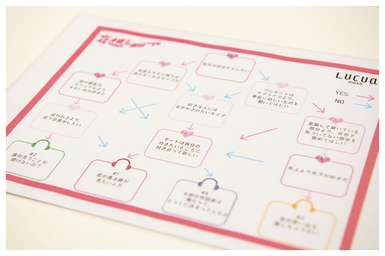 - 診断チャートにチャレンジいただき、あなたの今の気分にぴったりな「甘いセリフを言う人」を1名、導き出します。ヘッドフォンから聞こえてくる、甘いセリフが詰まった妄想ストーリーに載せて、イケメンボイスをご堪能いただきます。