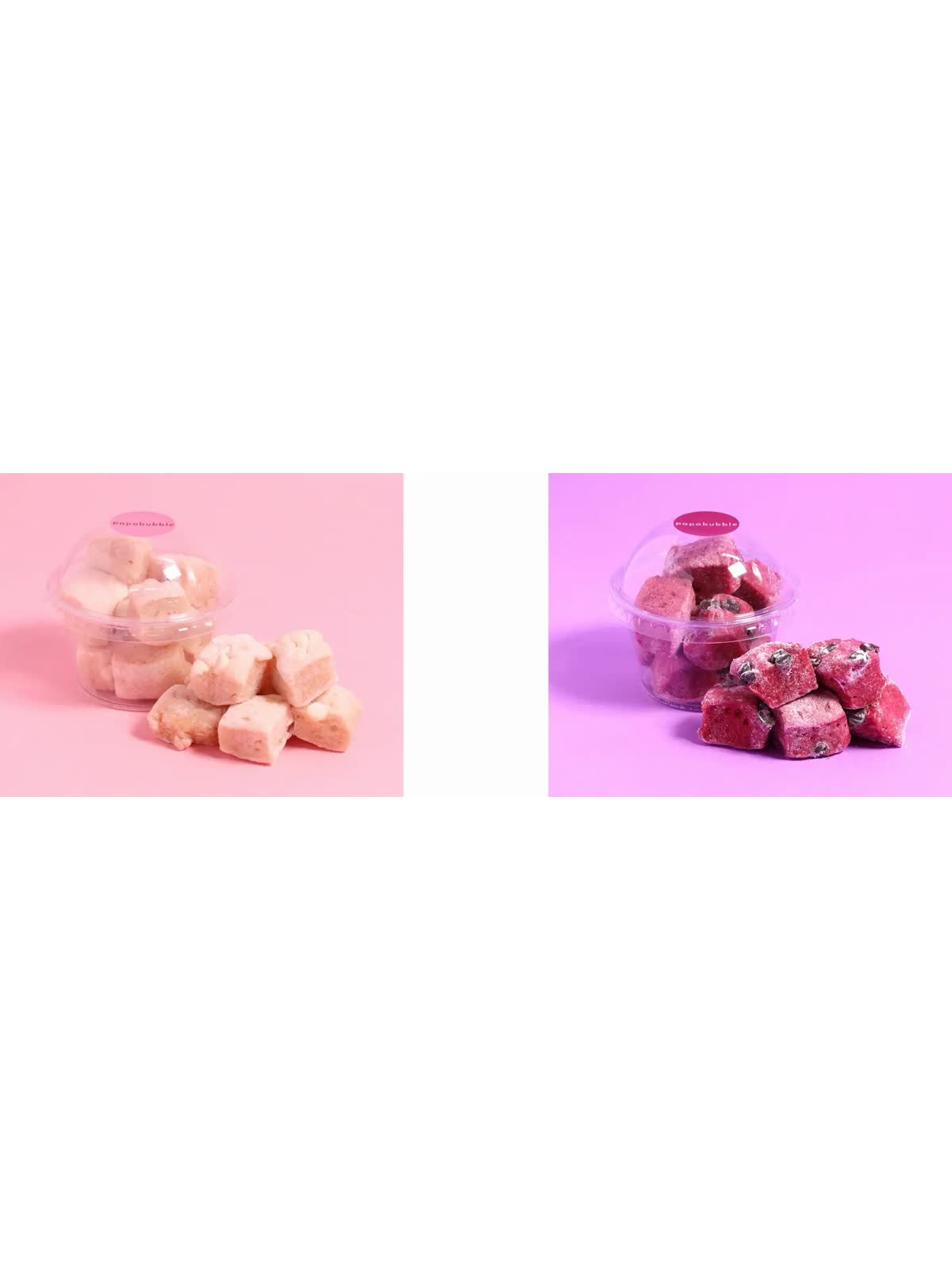 「ももマシュマロ」は、桃の香りが口いっぱいに広がるふわふわ食感が特徴です。厳選したピューレベースを使用しており、ほのかな酸味も感じられます。アクセントにホワイトチョコを使い、最後までおいしく召し上がっていただけるように仕上げました。「ぶどうマシュマロ」は、贅沢なぶどうスイーツをイメージしました。隠し味にカシスピューレを使用。甘さだけではなく、大人の渋みも感じながらジュワっと溶ける味わいが特徴です。チョコチップをアクセントに使用し、高級感のあるスイーツに近づけました。