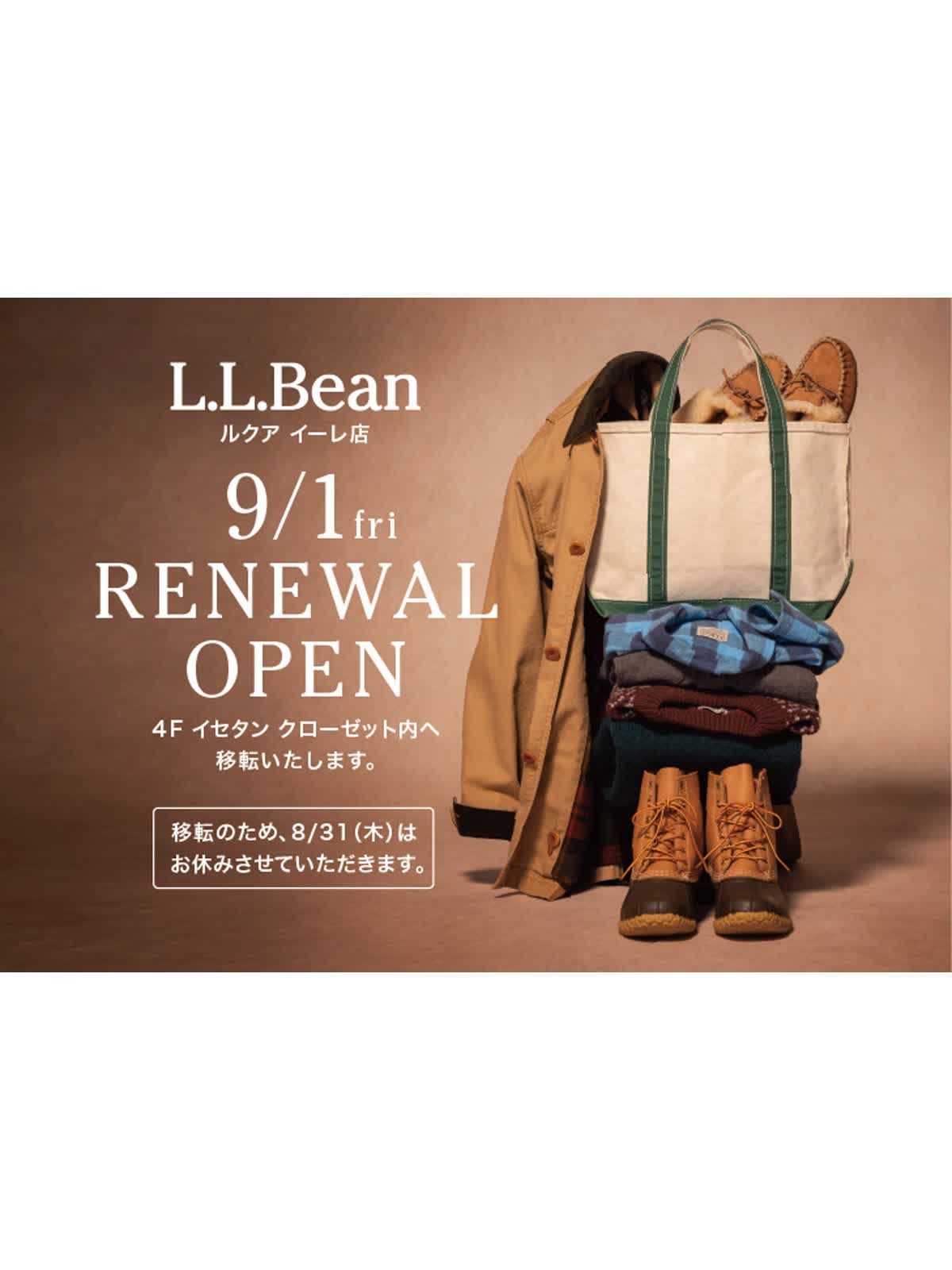 9月1日(金)より<エル エル ビーン>ルクア イーレ店は、現在の2階 イセタン アーバンマーケットから、4階 イセタン クローゼット内へリニューアルオープンいたします。