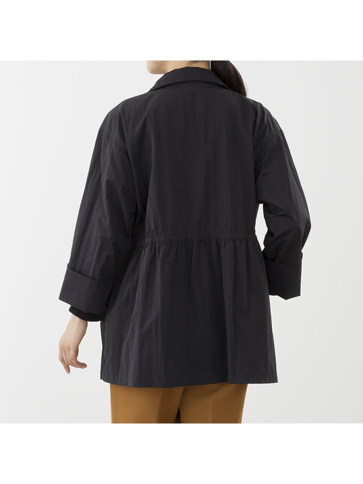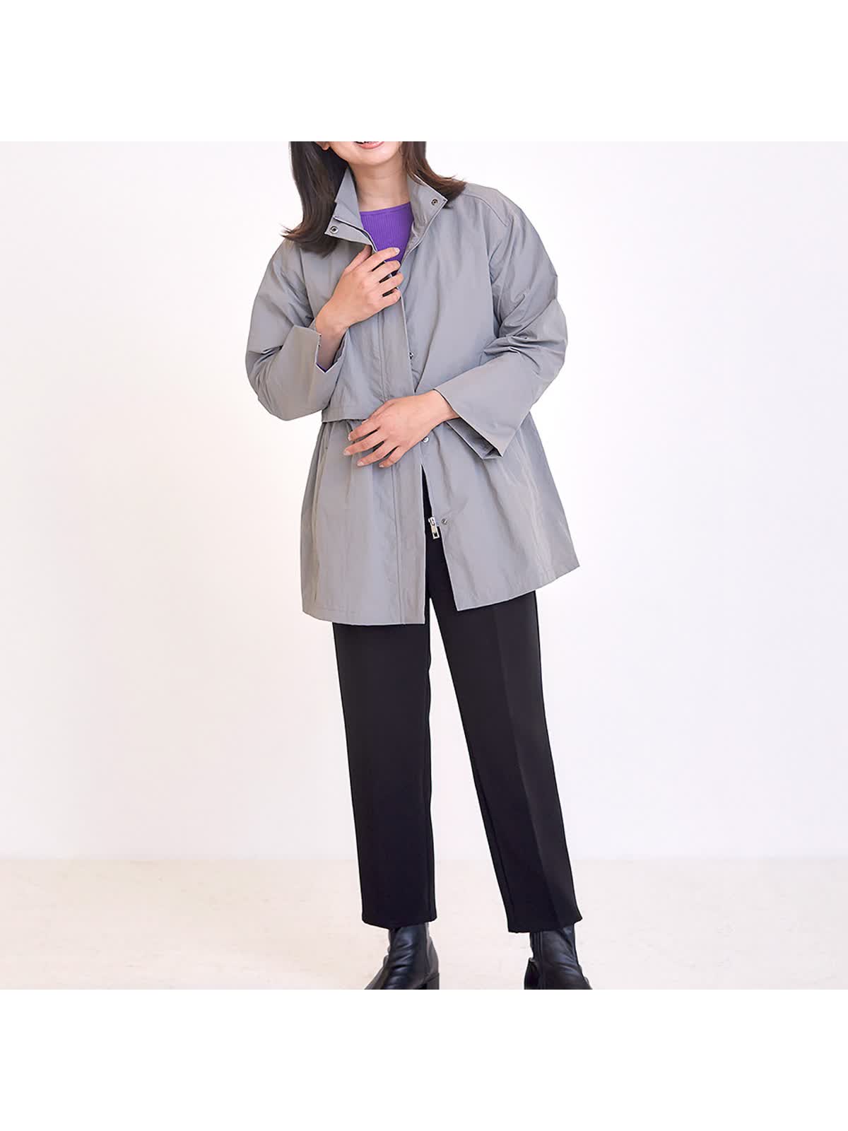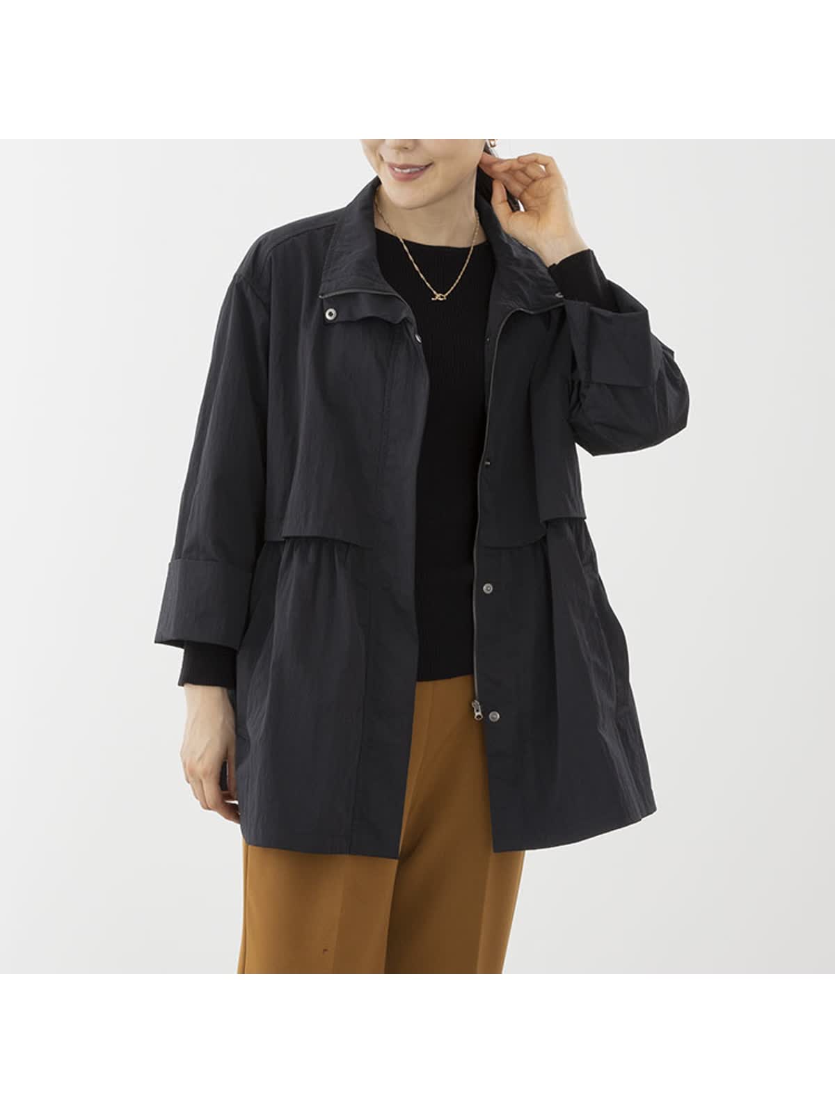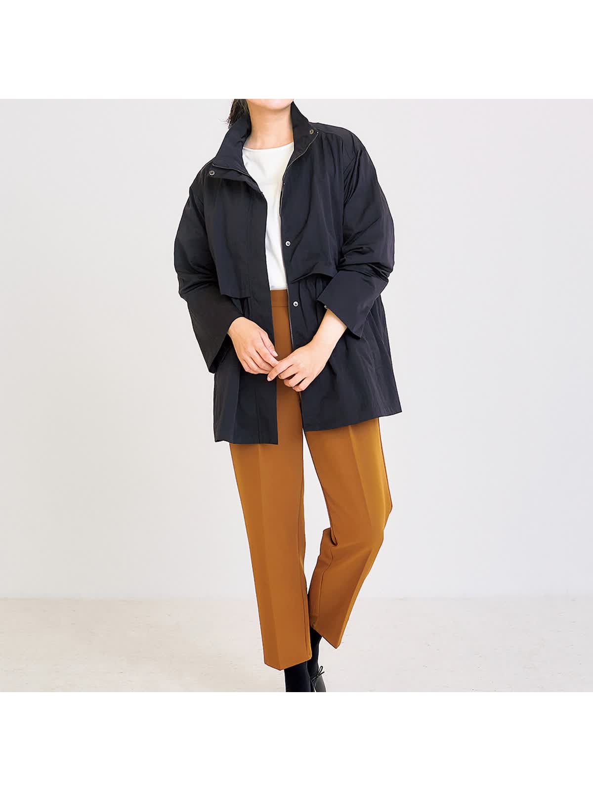 スタンド衿が大人っぽく、ウエストのたっぷりギャザーデザインが羽織るだけで着映えるアウターです。