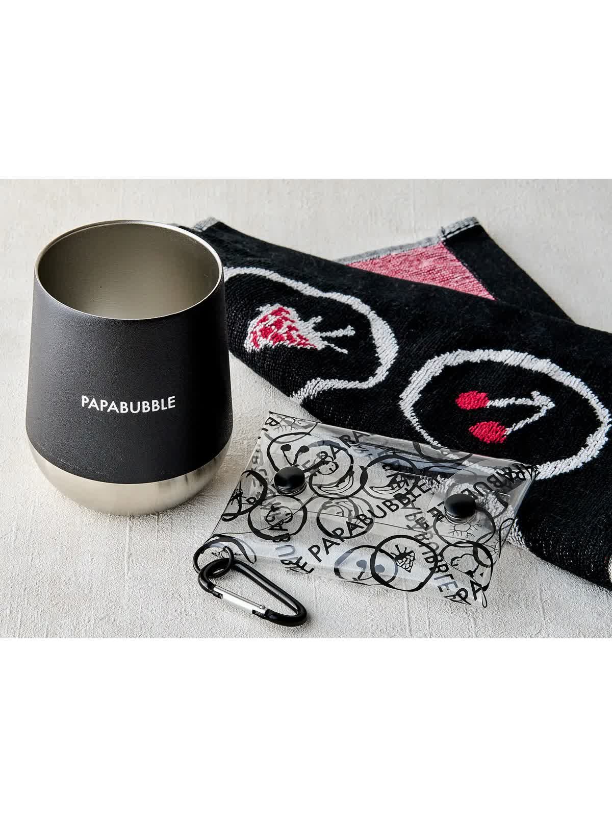サーモマグは、その表面にはPAPABUBBLEロゴを、裏面にはりんご・チェリー・バナナのキャンディ柄をあしらったシンプルなデザインが特徴です。真空二重構造により、どんなに熱い飲み物を入れても外面が熱くならず、そのまま気軽に持つことができます。
