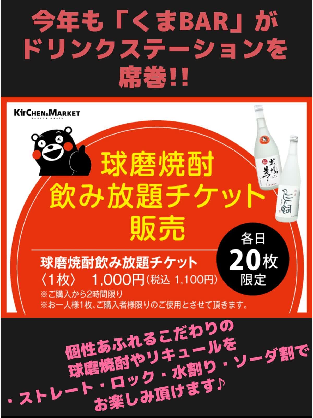 ドリンクステーションに今年も「くまBAR」が出現!26の蔵元から厳選した球磨焼酎やリキュールが、ロックやソーダ割等色々な飲み方で楽しめて、しかも1,100円(税込)で飲み放題チケット🎫も販売‼️
