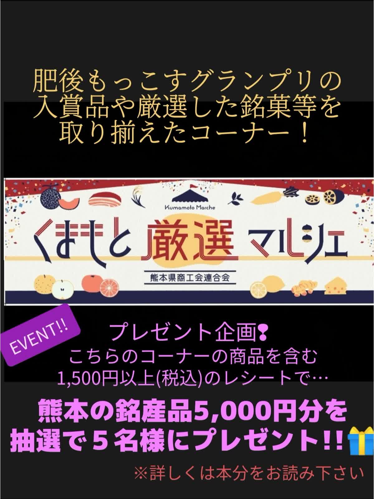 期間中、肥後もっこすグランプリ受賞品をはじめ、厳選した熊本商品が並ぶ「くまもと厳選マルシェコーナー」の商品を含む1,500円(税込)以上のレシートを、キチマカウンターにある応募用紙に必要事項を記入してレシート貼り付け、応募BOXに投函すると…