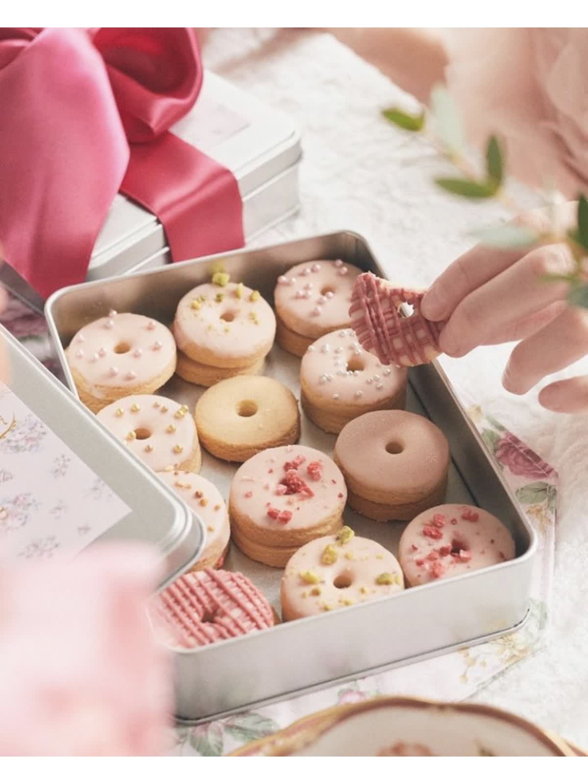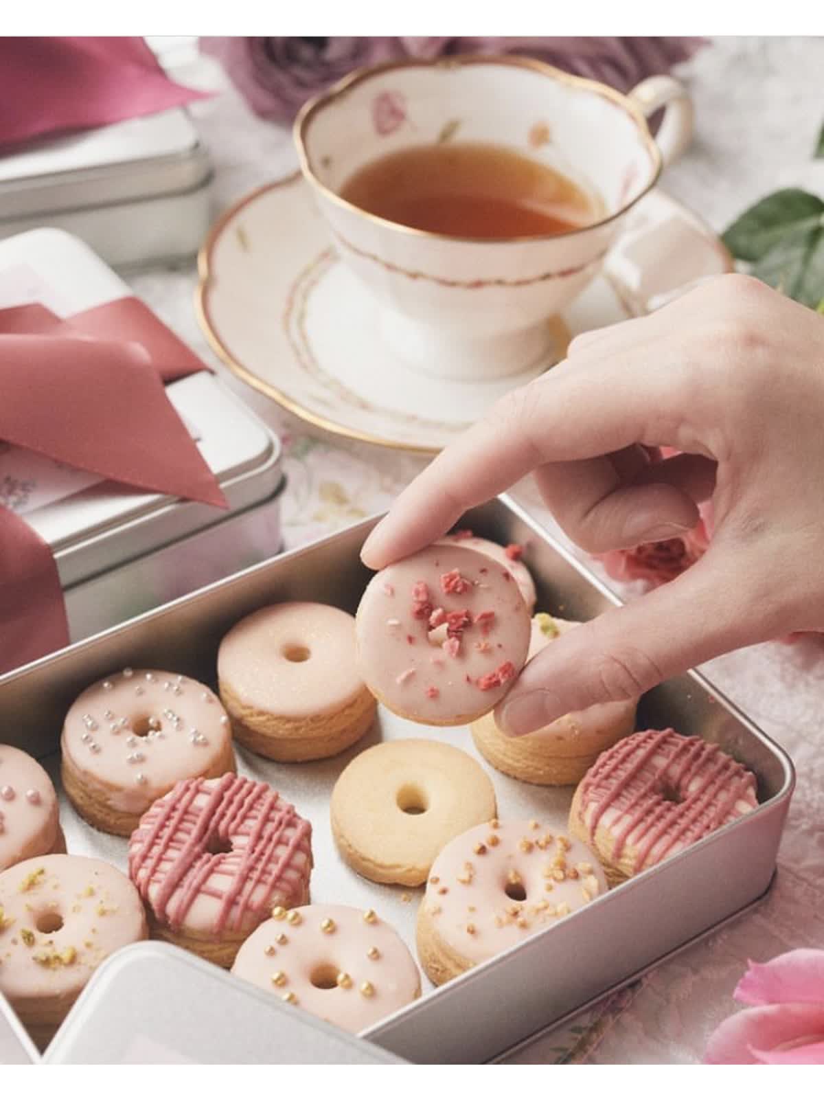Maison de FLEURらしさを表現するためにアンティークローズの花をイメージし、蓋を開けた特にバラの花が缶の中に詰められているようなピンクのアイシングクッキーに🌹