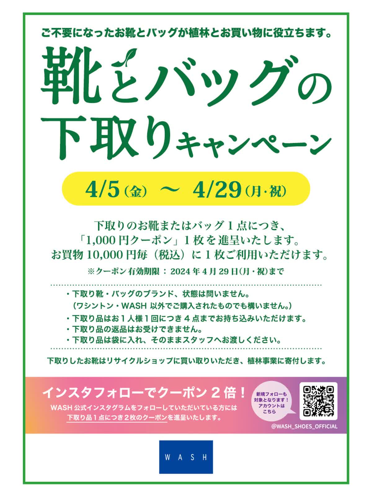 ルクア 7F ウォッシュ 毎年、ご好評いただいております、下取りキャンペーンが開催されます! 下取りの靴またはバッグ1点につき、当店でお使いいただける「1,000円クーポン」1枚を進呈。 お買物10,000円(税込)毎に1枚ご利用いただけます。 また、WASH公式インスタグラムをフォローしていただくと、クーポンの枚数を2倍で進呈!! 下駄箱の整理ができて、お得に購入できるこの機会に、是非、ご利用くださいませ。 上記以外にもキャンペーンを開催して、皆様のご来店を心よりお待ちしております。 ショップニュース⼀覧