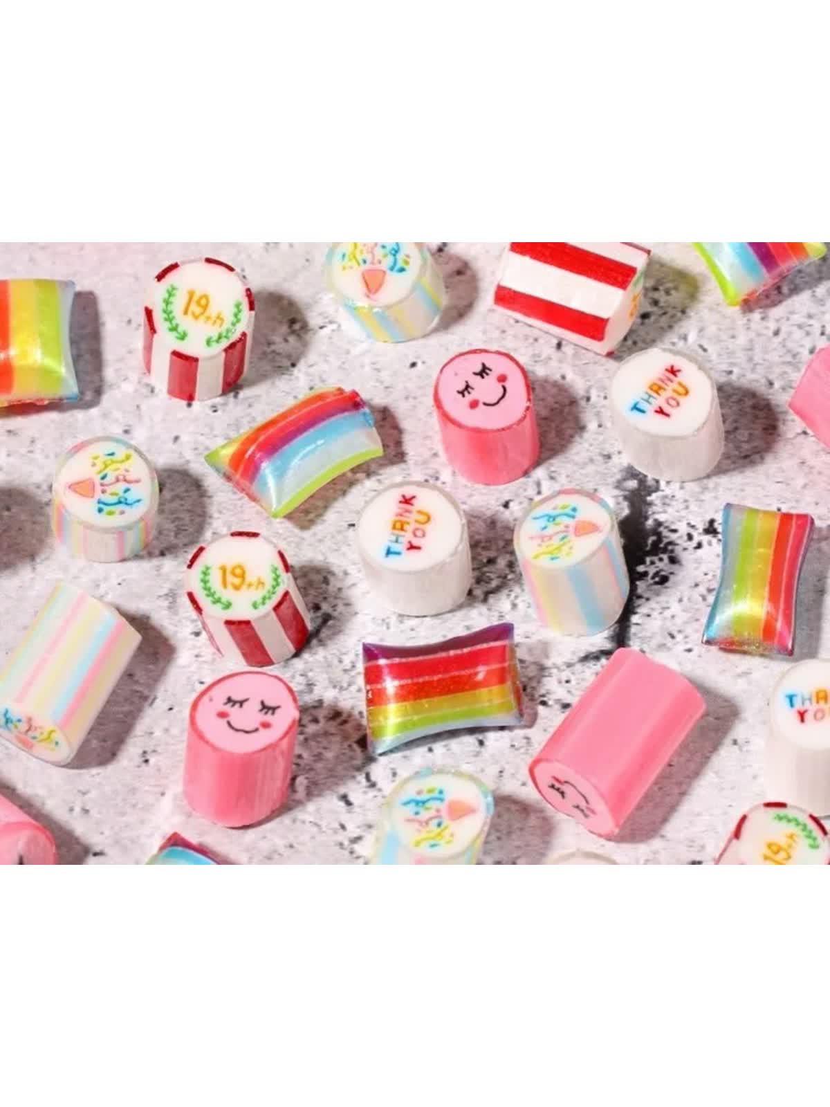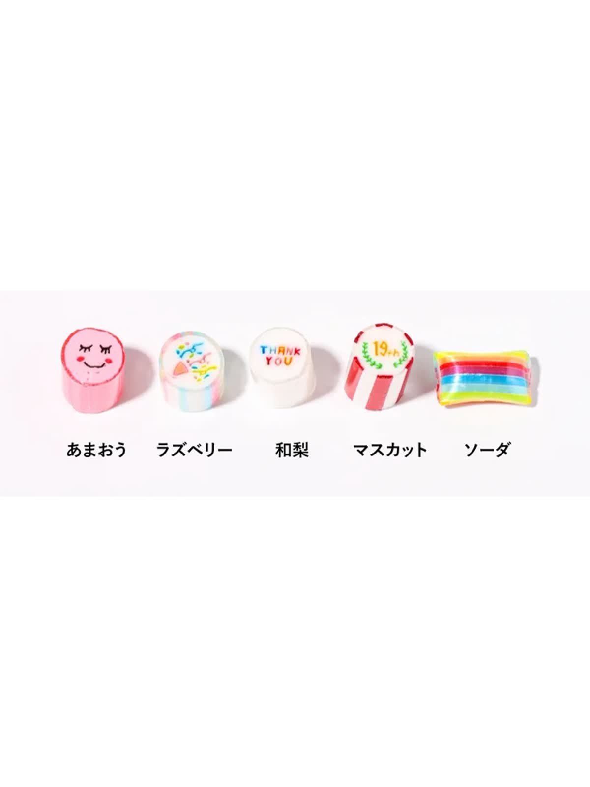 19周年の感謝をテーマにしたプレミアムキャンディミックスです。「ありがとう」とお辞儀をしているようなにっこりとした表情、感謝の気持ちを込めたthank youの文字、そしてクラッカーと19thの文字を入れた、まるでパーティーのようなカラフルで華やかなデザインに仕上げました。あまおうや和梨の限定フレーバーも入っており、特別感もプラスしています。