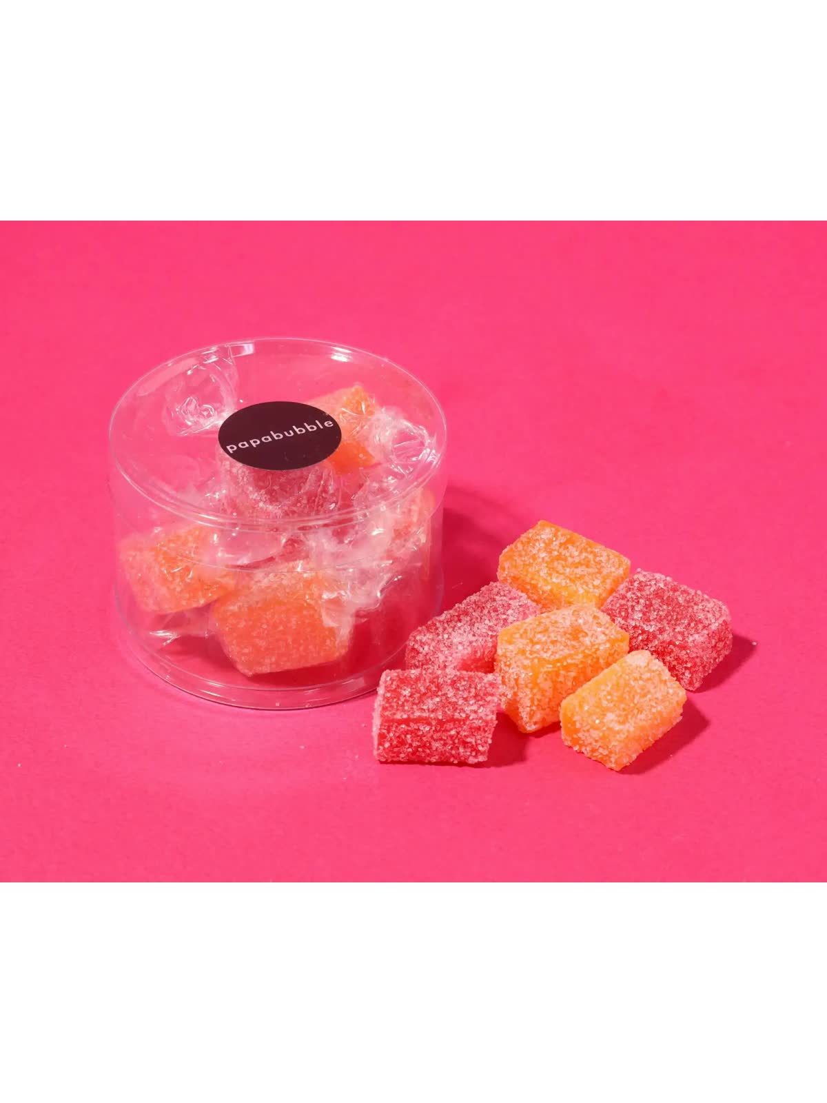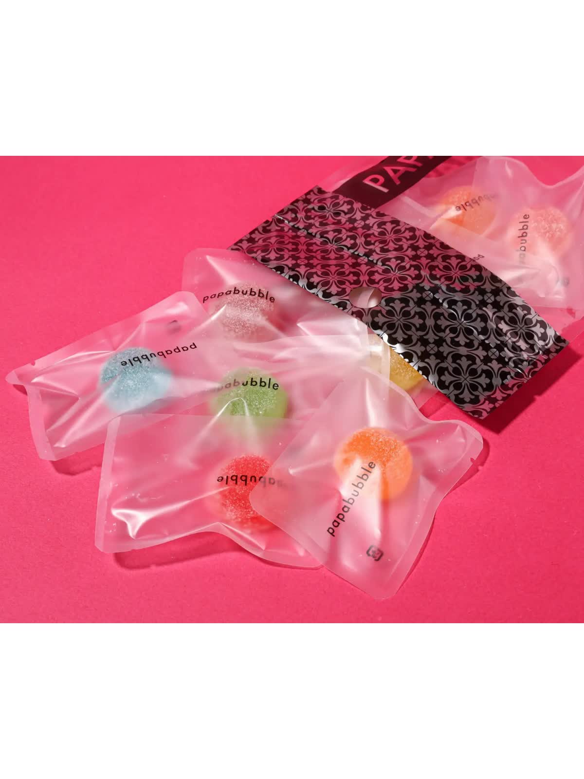 定番グミの「バブレッツ」とは異なり、硬くて歯ごたえのあるハード食感のグミです。贅沢にピューレや濃縮果汁を使用し、濃厚な味わいに仕上げました。キャンディ包みになっているので、見た目もかわいくシェアにもおすすめです。フレーバーはミックスベリー、パッションオレンジ、レモン、パイン、マスカットポムの5種類。ミックスタイプにのみ、限定フレーバーのマスカットポム入りです。