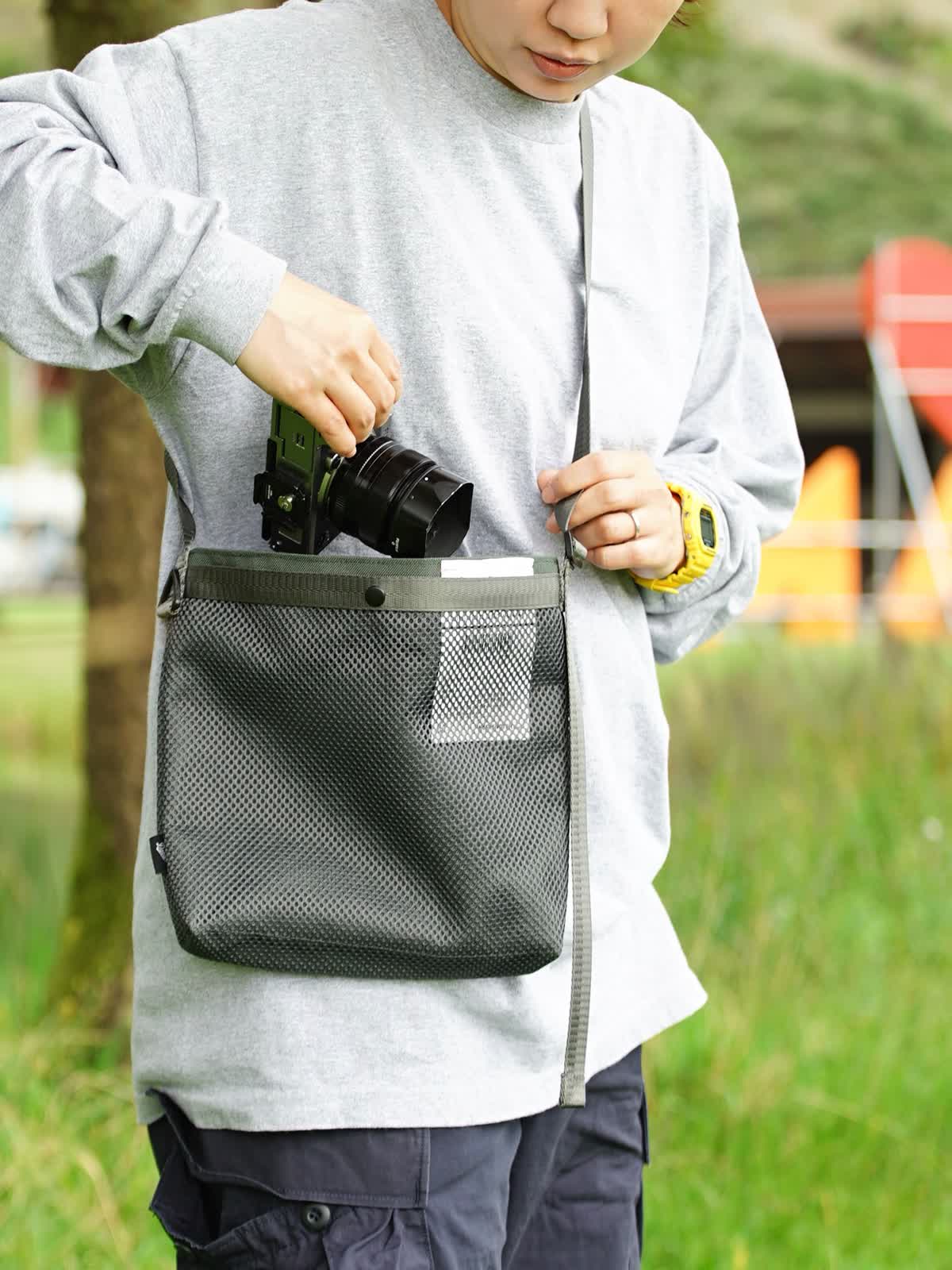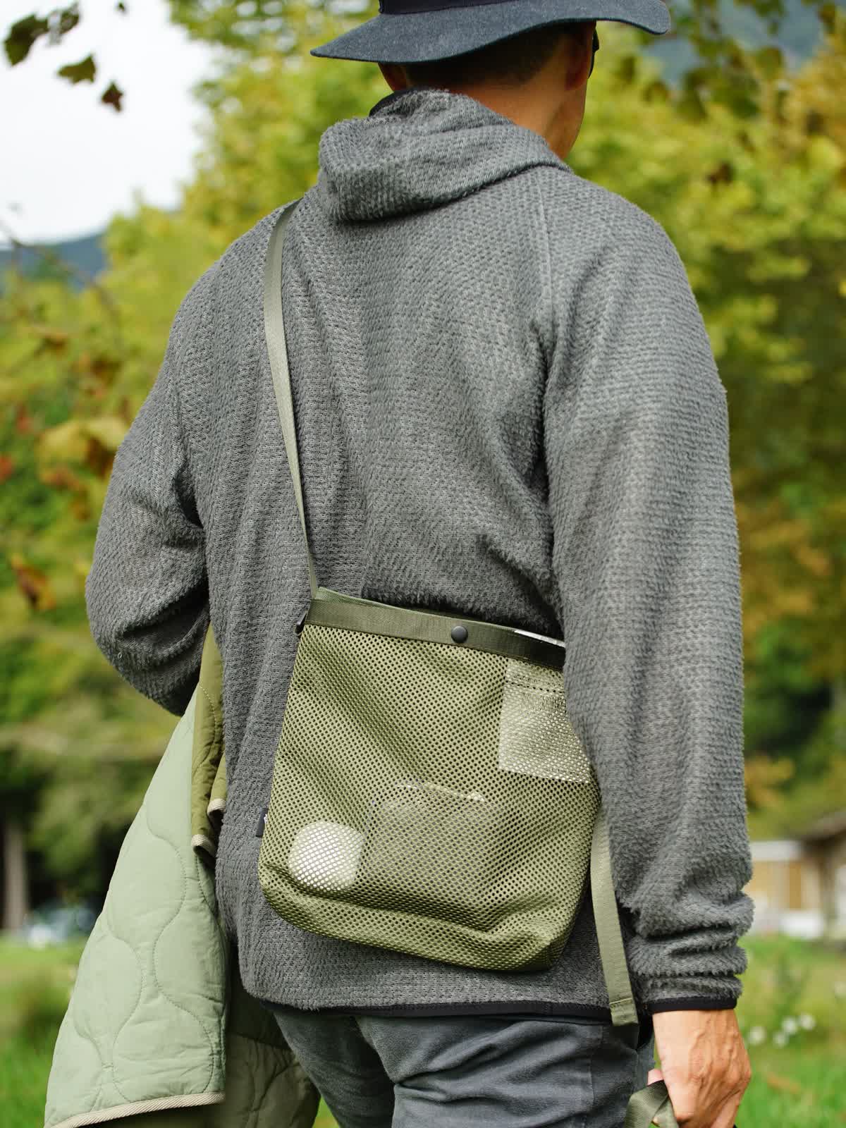 ナイロン生地とメッシュをコンビネーションしたユーロミリタリーなカラー展開のスモールサイズショルダーバッグ。コシのあるナイロン生地をポリエステルのメッシュ生地で覆ったデザインです。 ユーロミリタリーを意識したカラー展開で通年使えます。 本体前後のメッシュ部分がポケットになっています。 必要最小限の荷物を収納するポケット代わりの便利なサイズ感。デイリーからトラベルまで色々なシーンで活躍。