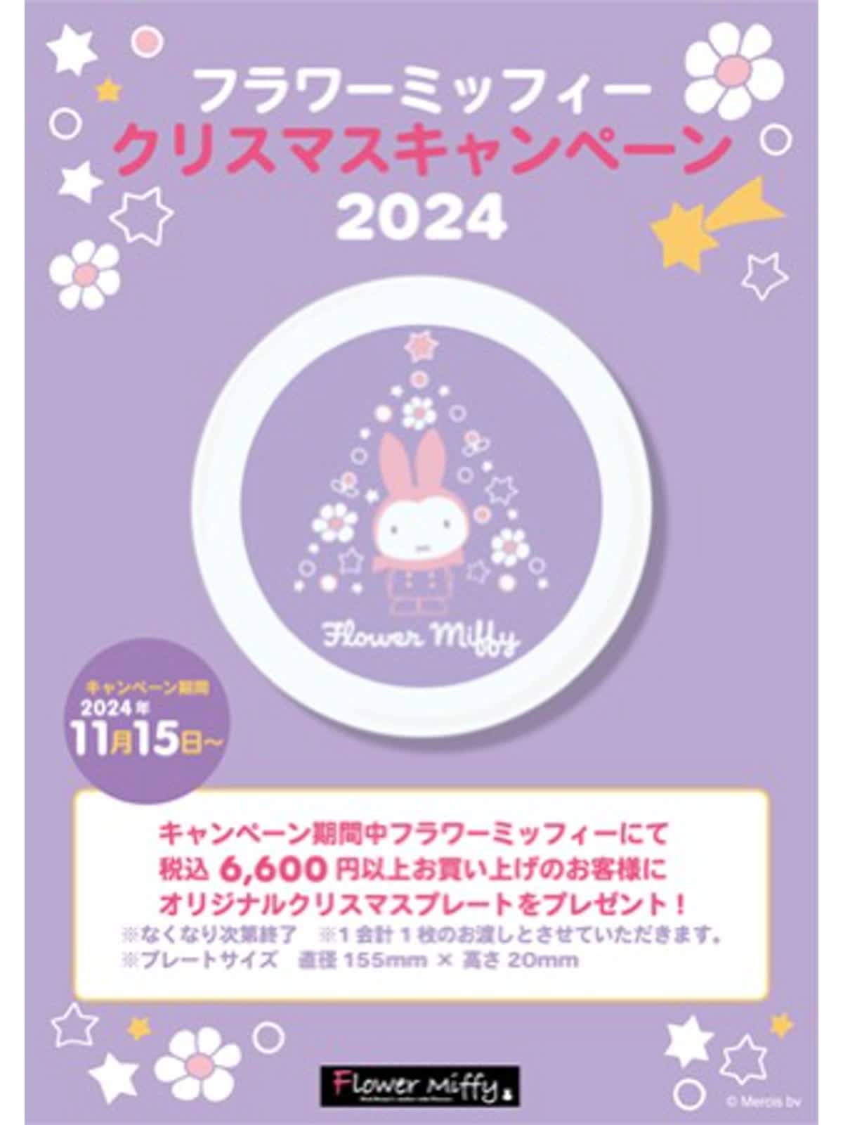 2024年11月15日(金)より商品を1会計につき6,600円(税込)以上お買い上げいただいたお客様へ、「フラワーミッフィー オリジナルプレート(非売品)」をプレゼントするノベルティキャンペーンがスタートいたします♪