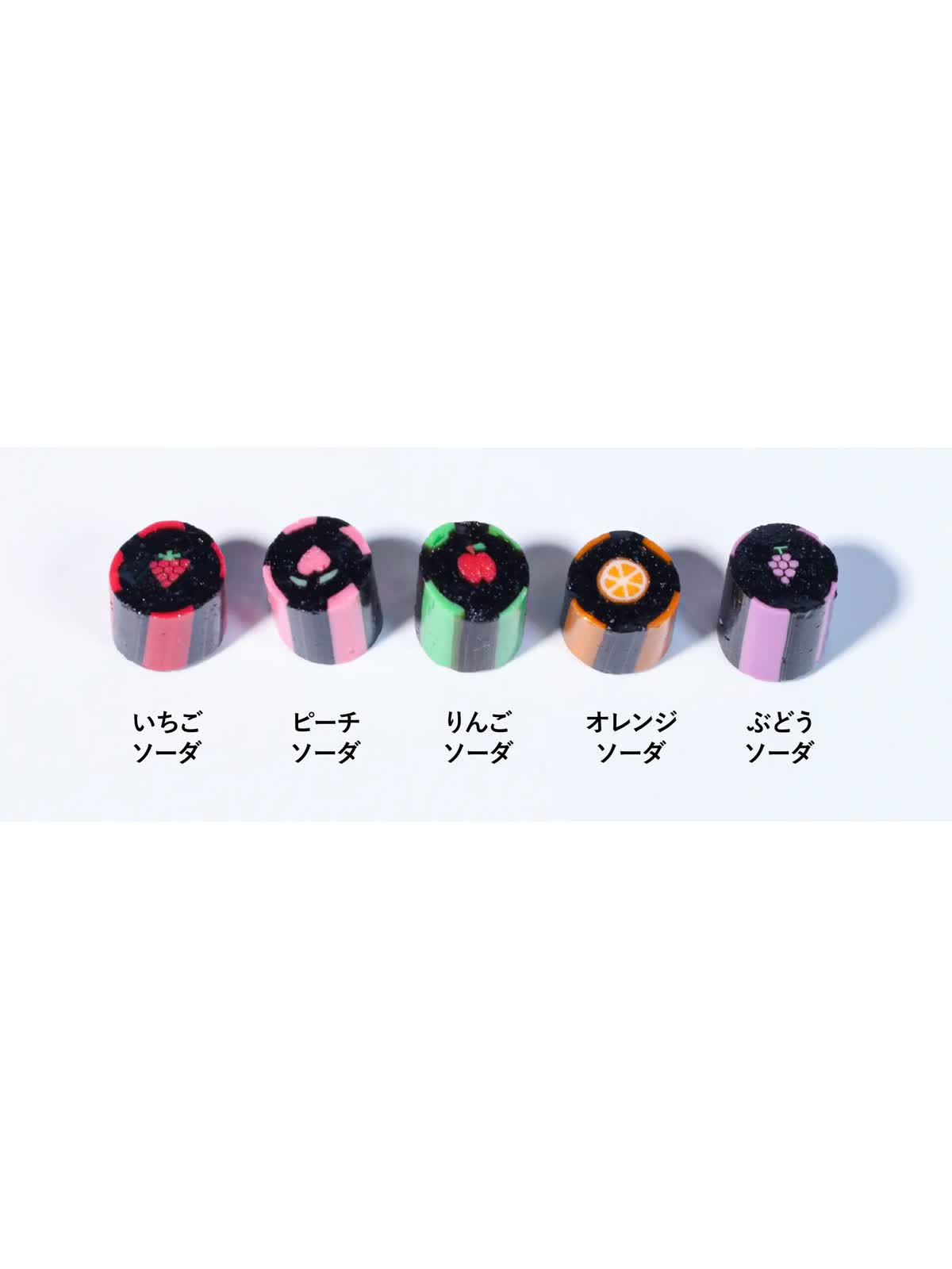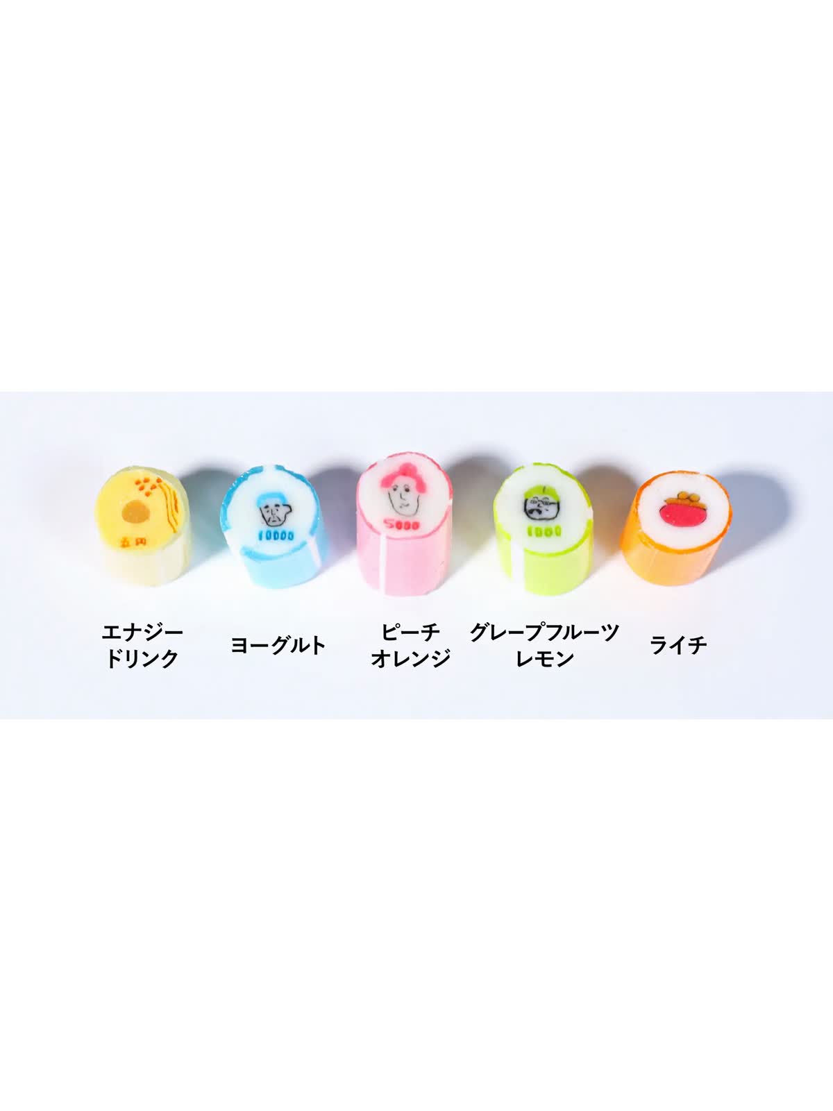 2024年7月から発行が開始された新紙幣や、馴染みのある硬貨を絵柄にしたキャンディです。ゆるいながらも特徴を捉えた「渋沢栄一」「津田梅子」「 北里柴三郎」3名の絵柄は、髪型や数字の造形に職人技が光ります。「エナジードリンク」「ピーチオレンジ」等、全て限定フレーバーで揃えました。