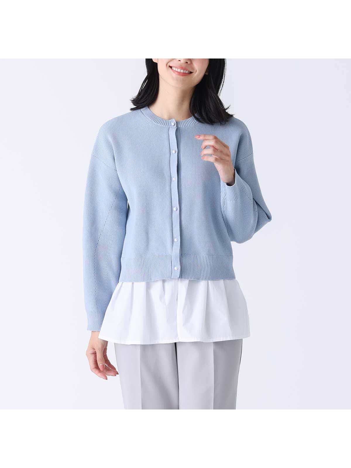 ・レイヤードライクな異素材のペプラムデザインが華やかなニットカーディガン