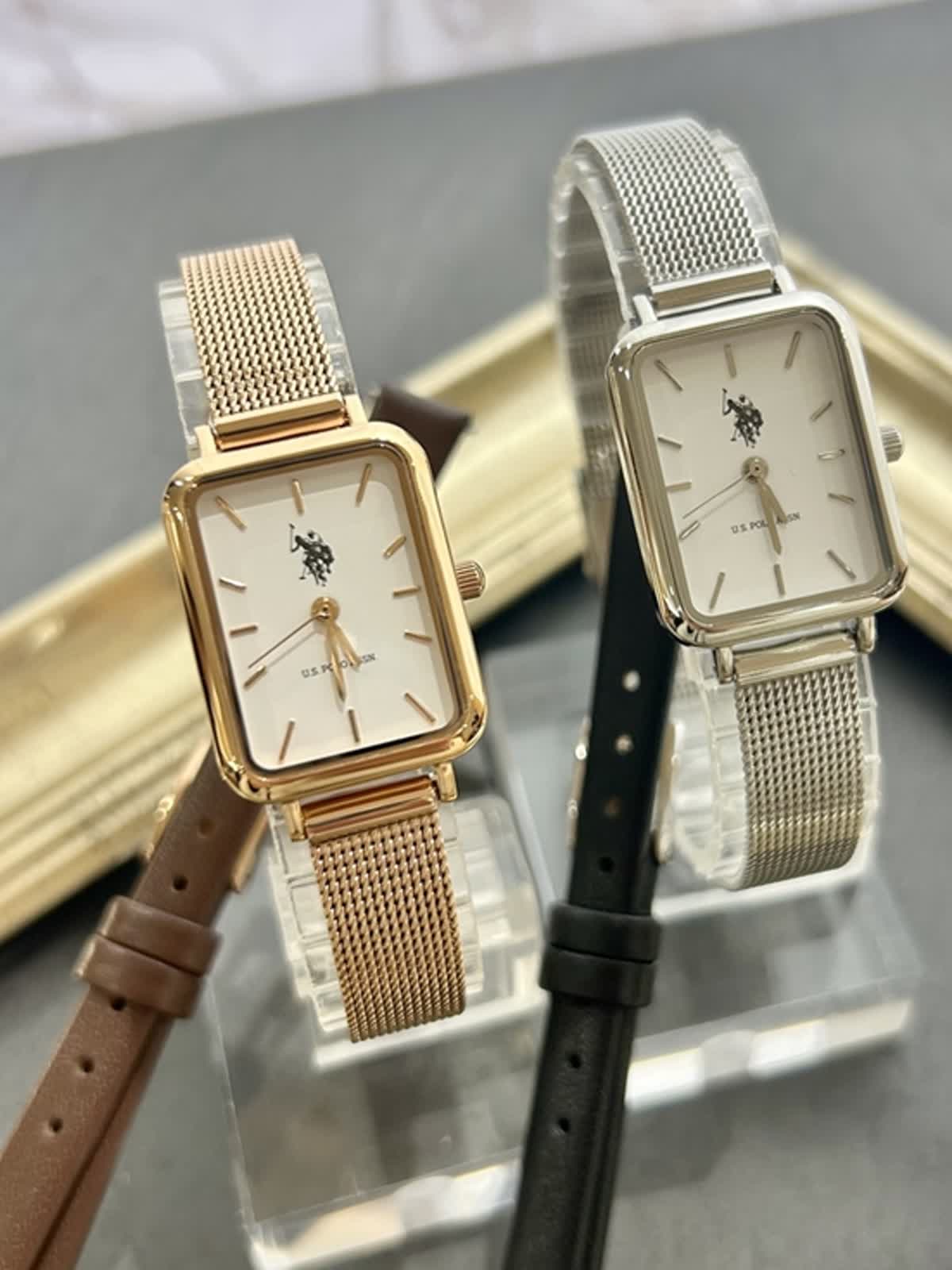 こちらの時計はメッシュのベルトと革のベルトの2way式になっています。お客様が自分自身で取り外しできる仕組みになっているのでその日の予定、気分に合わせてベルトを選択することができます。全体的にシンプルなデザインでまとめられていますが、U.S. POLO ASSN.のシンボルマークである馬のロゴがアクセントになっている素敵な時計です。