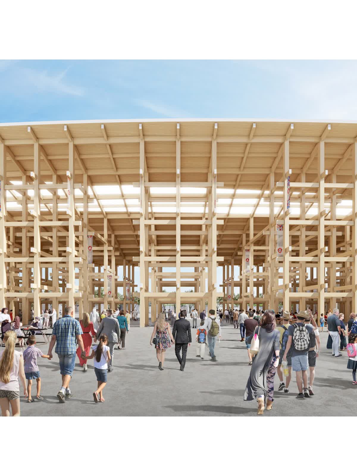 大屋根リングとしての痕跡・記憶をとどめ、端材そのままの風合いを活かした仕上げを行っています。