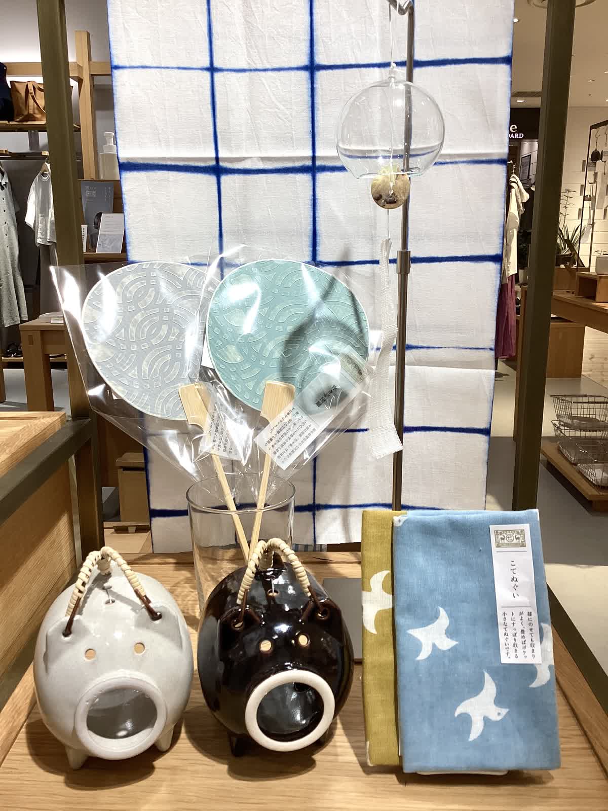 軒先で涼しげに揺れる風鈴や夏の景色を描いた団扇、素足に気持ちいい麻を使ったスリッパなど、