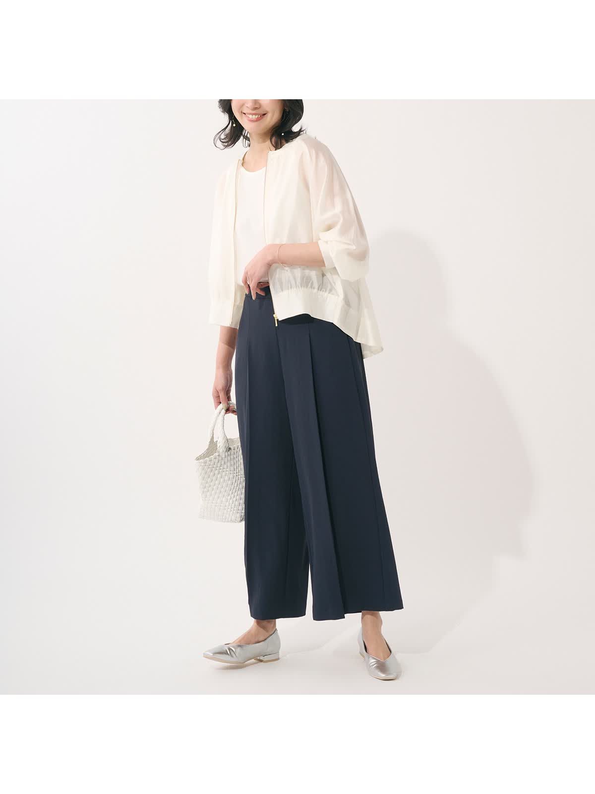 同素材のパンツとのセットアップはよりキレイ見えしオン・オフ問わず使えるアイテムです。
