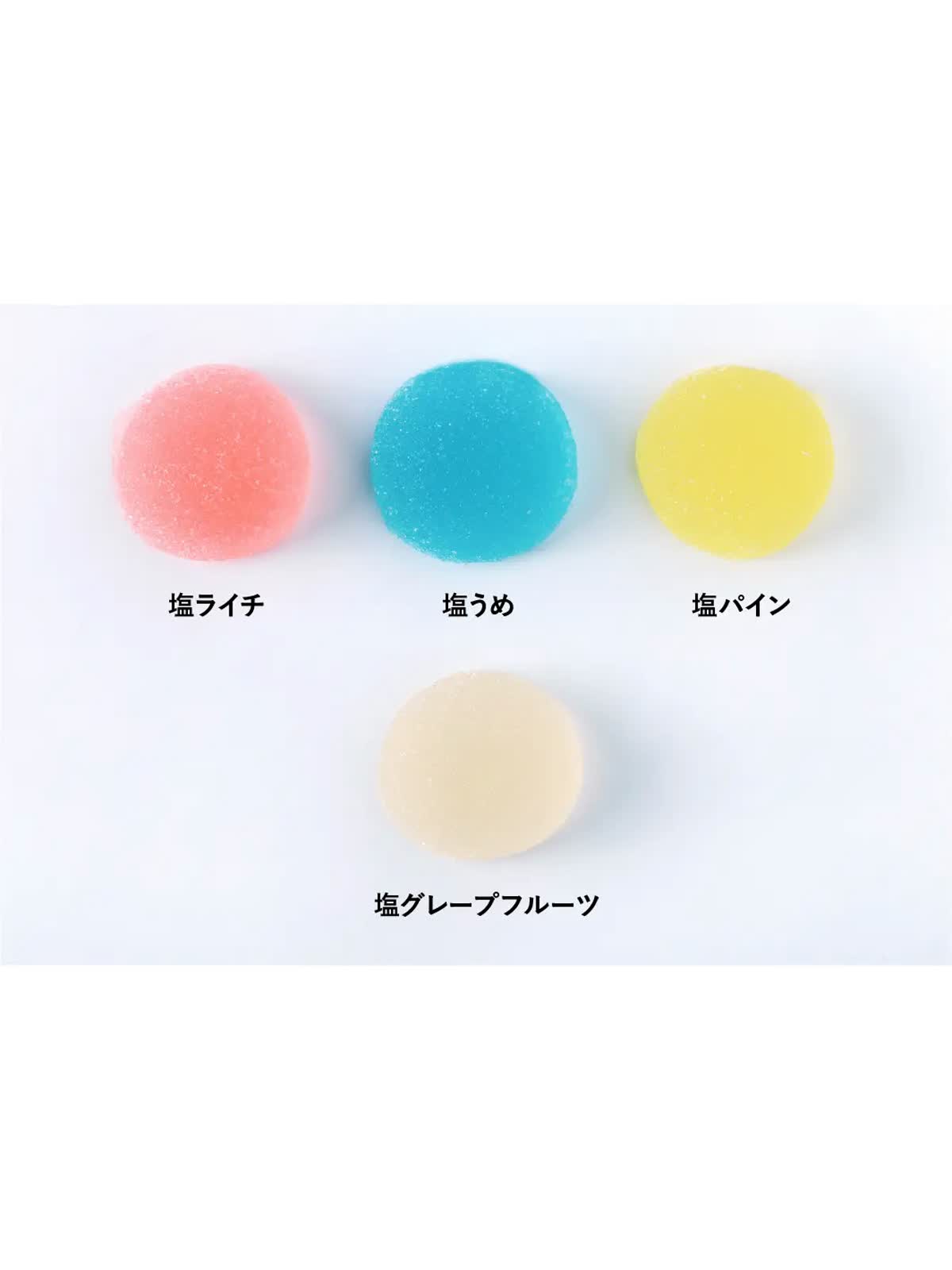 塩バブレッツには、人気のグレープフルーツと、塩味と相性の良いライチ・うめ・パインの3種を組み合わせました。ひと粒でしっかり満足できる大粒タイプで、食欲が落ちがちな夏場にも食べやすく仕上げています。外出時の塩分補給にも便利な個包装で、暑い季節のおともにぴったりの一品です。