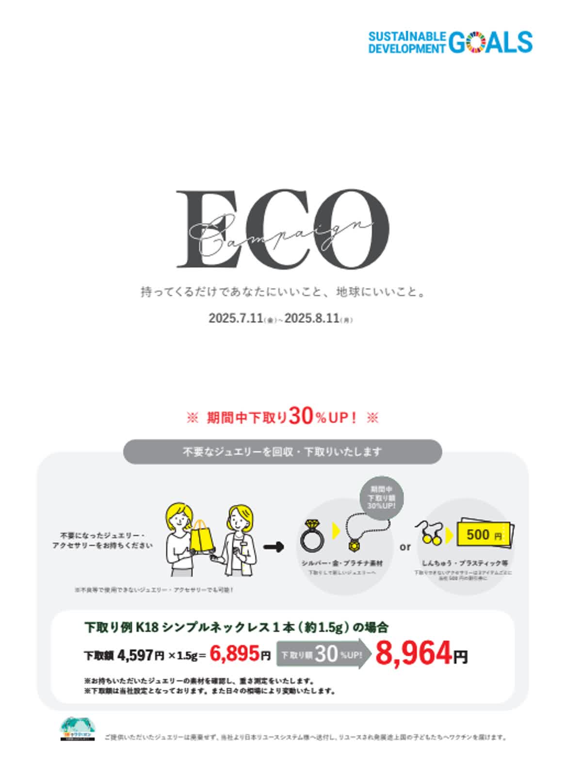 期間中、店頭に不要になったジュエリー・アクセサリーをお持ち込み頂くと、その場でBLOOM商品のお買い物券にご利用いただける500円分のクーポン券をプレゼントしております。
