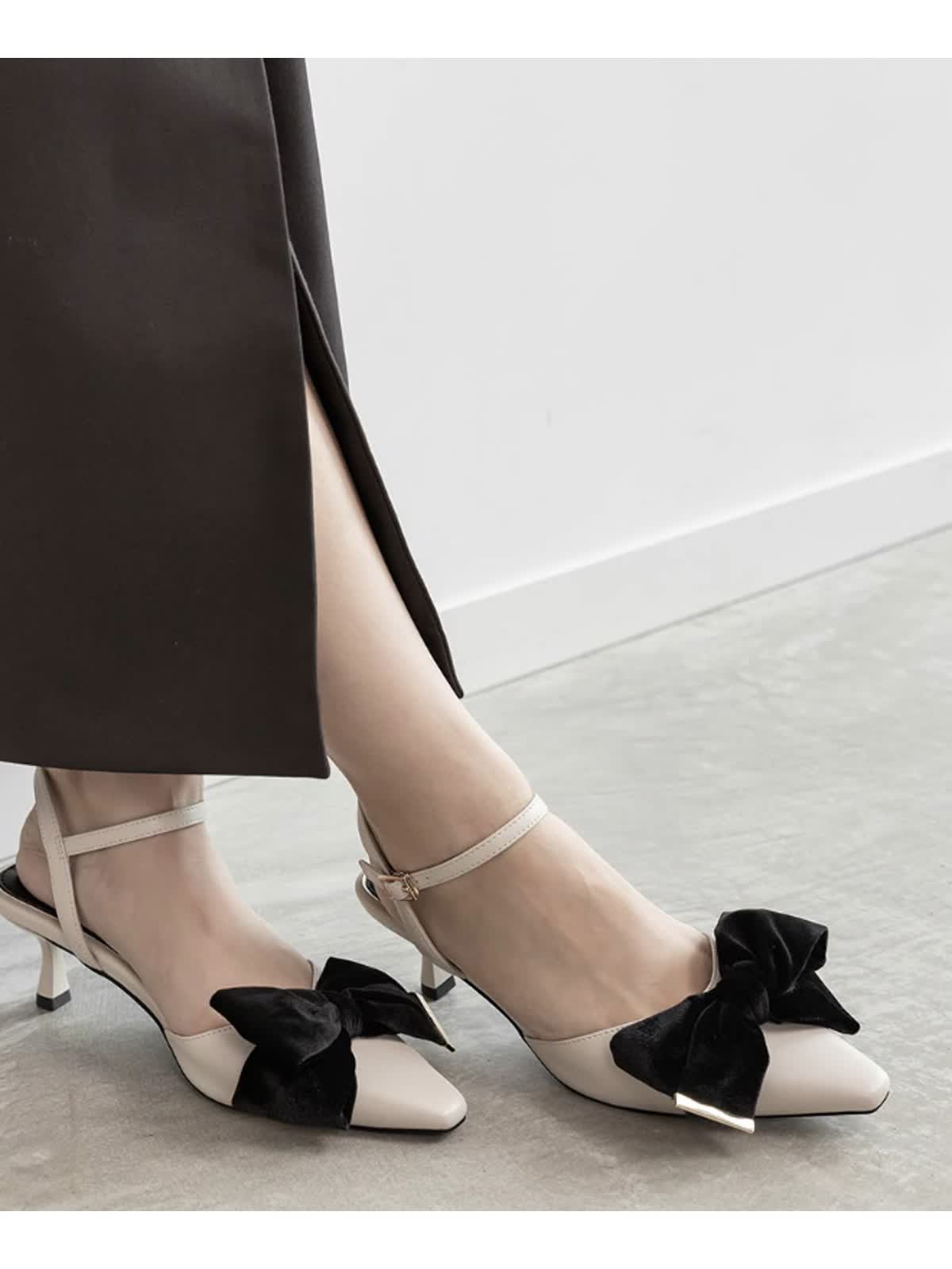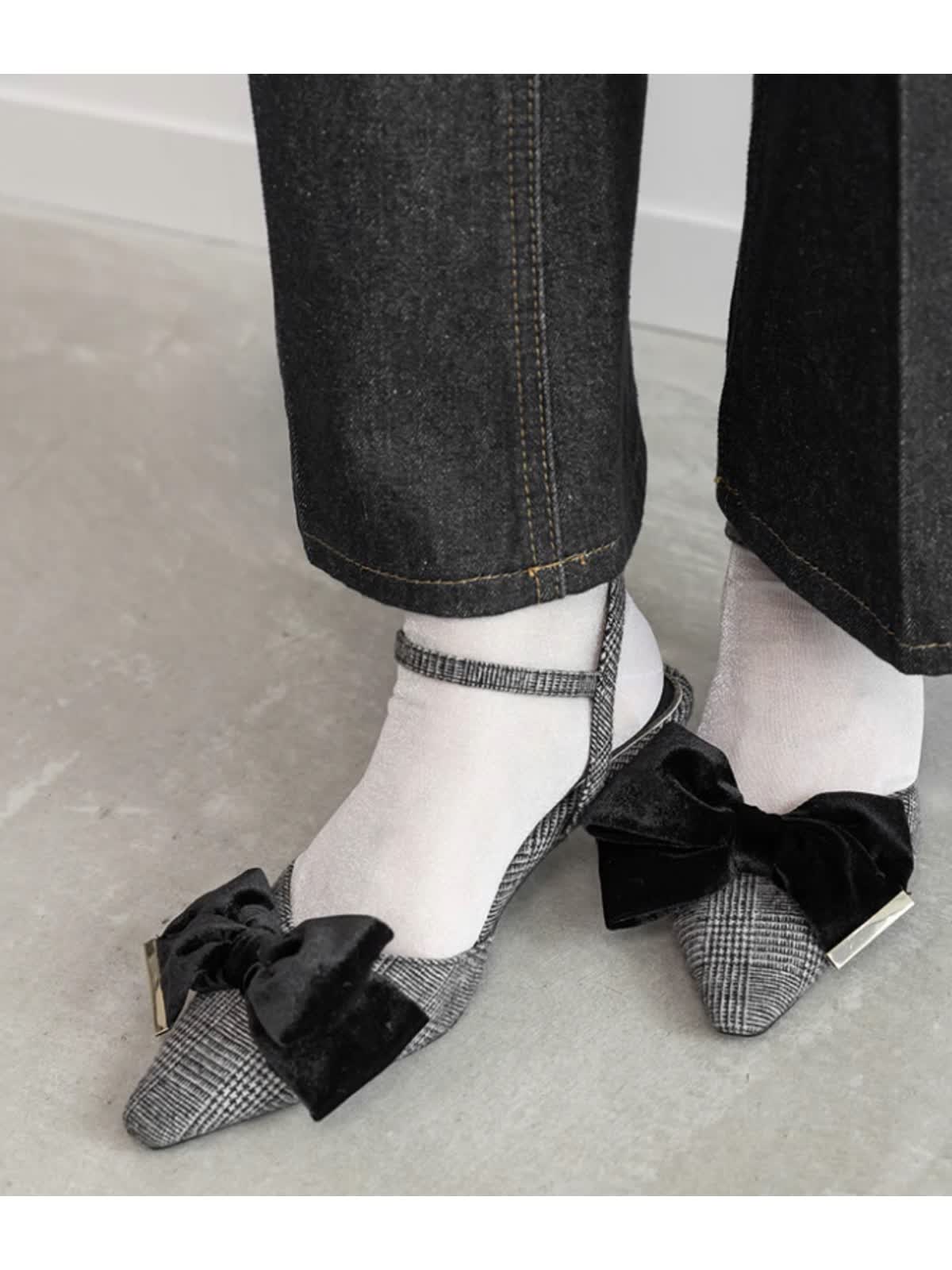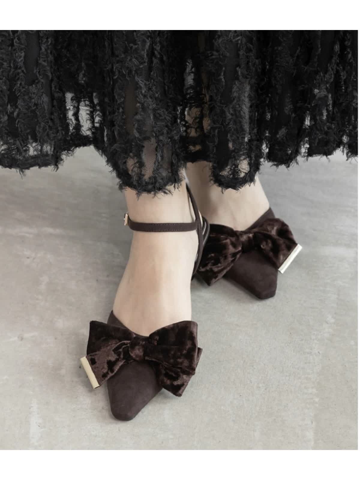 フロントに大ぶりなベロアリボンをあしらったストラップパンプス。