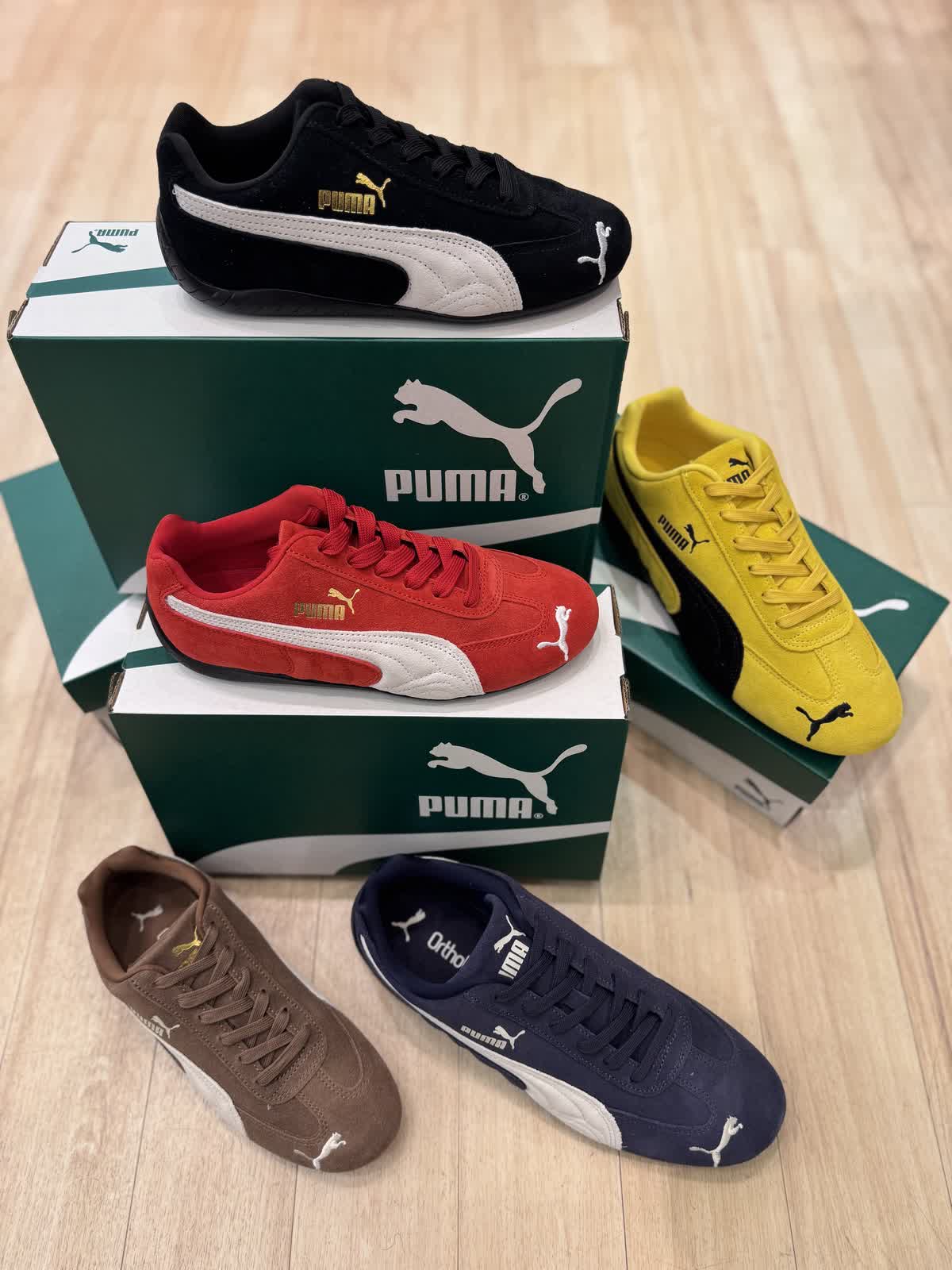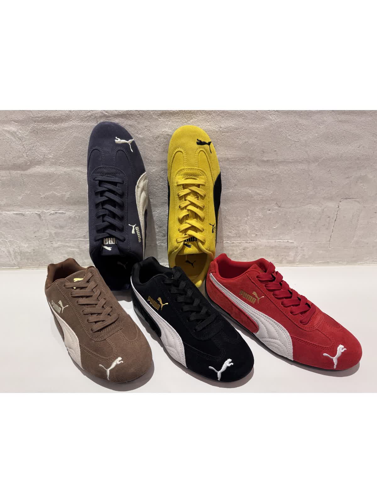 スピードキャットは、1999年に誕生し、80年代から90年代にかけてF1グランプリのドライバーが履いていた耐火レーシングシューズをベースにしたライフスタイルシューズです。レーシングにインスパイアされたなめらかなラインと空気力学に基づいたデザインにより、ファッションやスニーカーカルチャーに衝撃を与えてきました。今回、再びリリースされるスピードキャットOGは、F1レーシングチームを彷彿とさせる豊富なカラー展開とスウェード素材をふんだんに使用した仕上がりとなっています。2000年代初頭のレーシングウェアに敬意を表し、つま先には“プーマキャット”の刺繍が施され、シュータンとフォームストリップの上にはゴールドのロゴがあしらわれています。