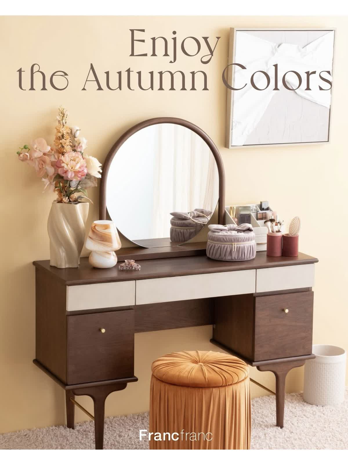 あたたかみのある色合いや上質な素材感で、お出かけ前にさりげなく秋のムードを添える、この季節ならではのインテリアシーンを提案します🪞