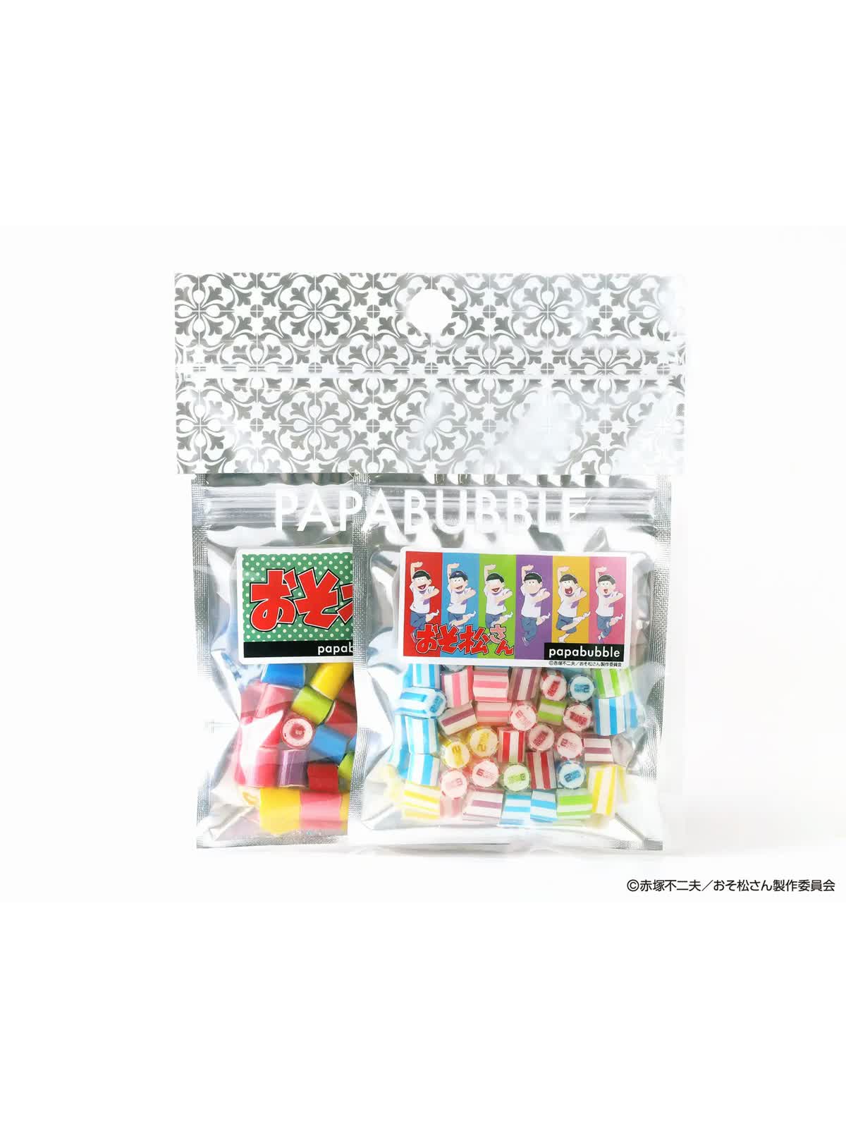 6つ子の顔シルエットをモチーフにしたキャンディと、名前入りデザインキャンディをセットにした、2袋入り商品が登場します。