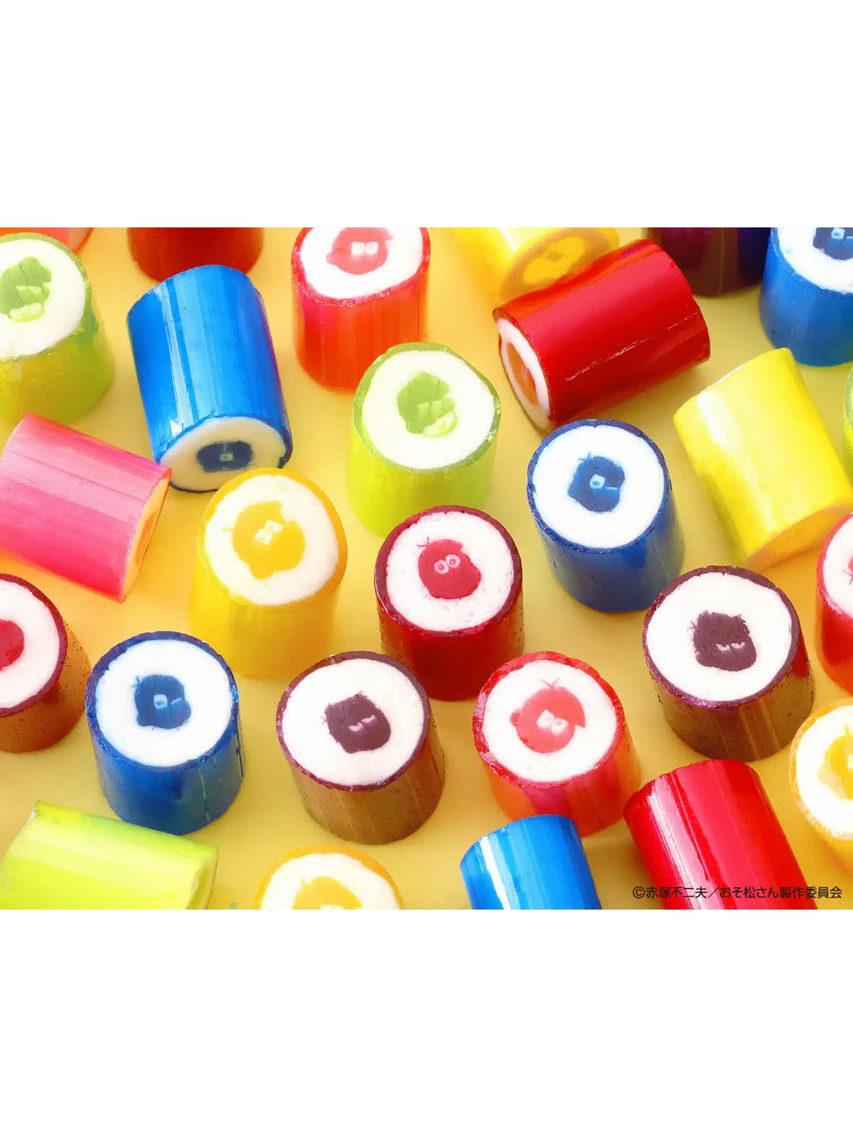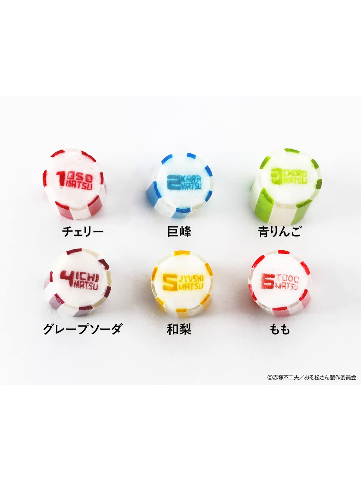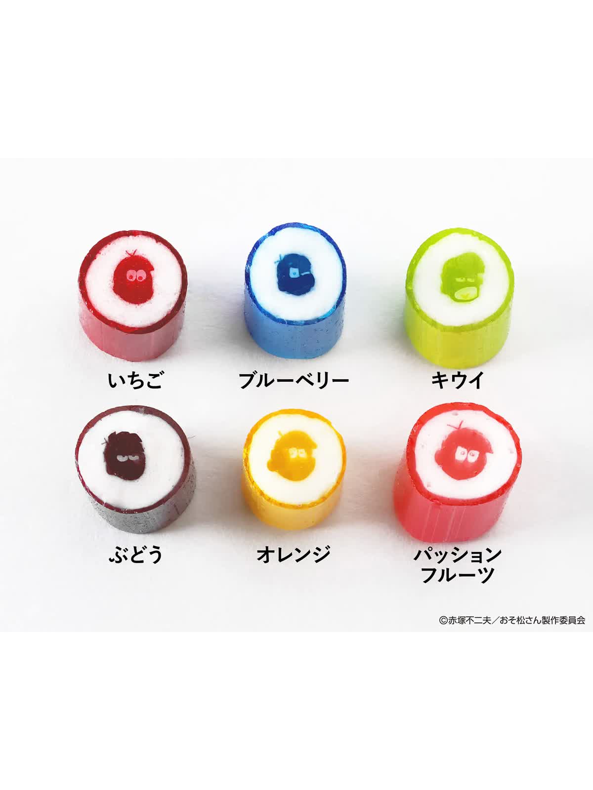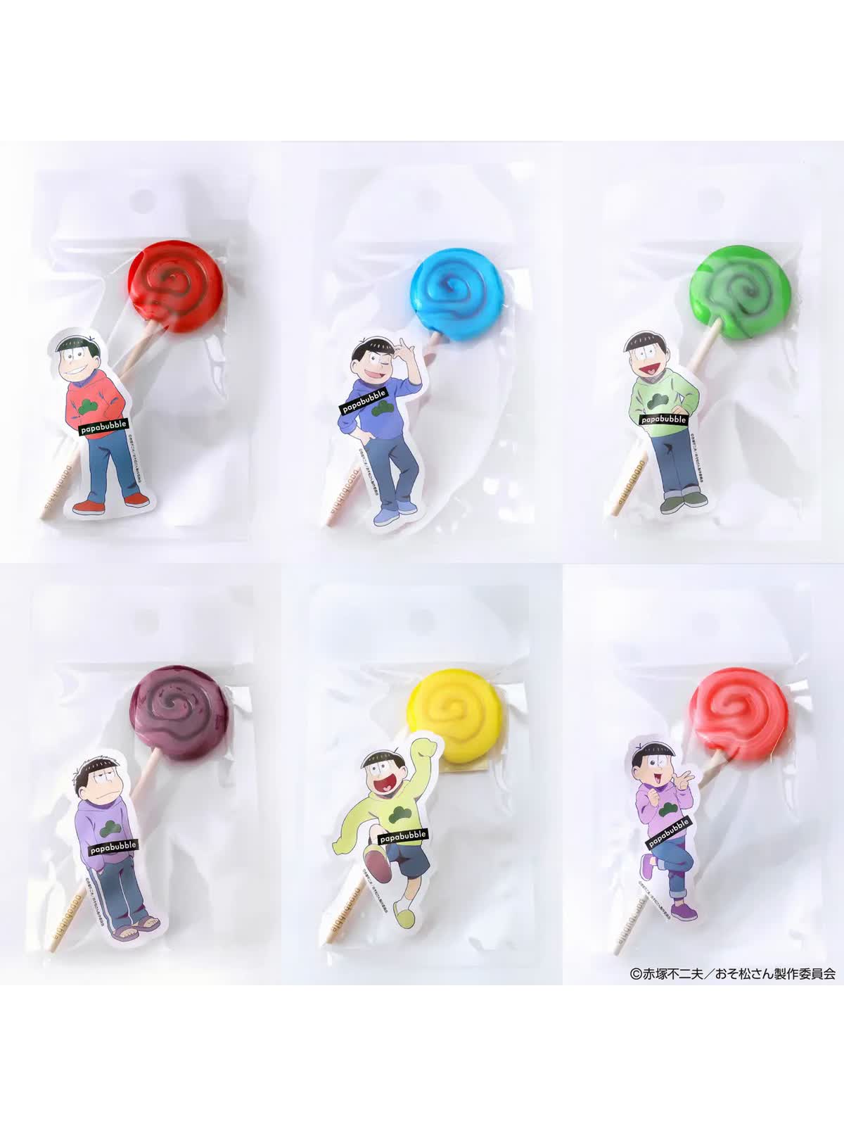 おそ松、カラ松、チョロ松、一松、十四松、トド松の6人それぞれのイメージカラーで仕上げたロリポップキャンディと、個性あふれるパッケージが目を引くアイテムが登場します。