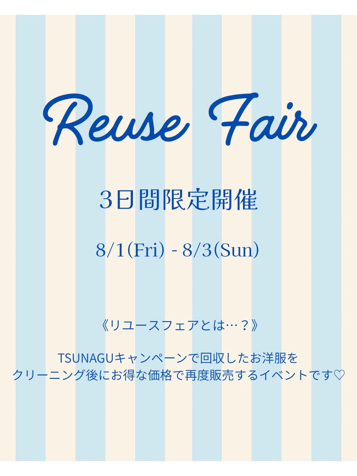 ルクア 6F フィント フィントでは3日間限定でリユースフェアを開催します♡ 販売するアイテムはフィントルクア店のInstagramにてアップしますのでぜひチェックしてください🦢 《開催期間》 8/1(金)〜8/3(日) 《リユースフェアとは…?》 TSUNAGUキャンペーンで回収したお洋服をクリーニング後にお得な価格で再度販売するイベントです💫 皆さまのご来店をお待ちしております🤍 ショップニュース⼀覧
