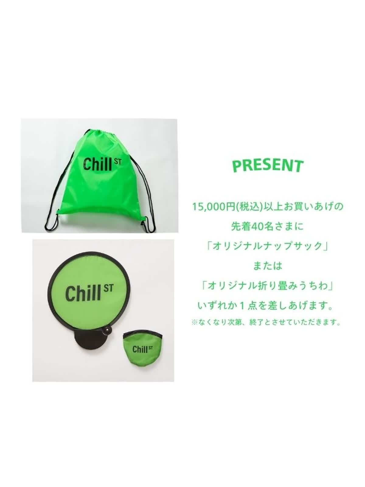 〈チルスト〉ポップアップショップで15,000円(税込)以上お買いあげの先着40名さまに「オリジナルナップサック」または「オリジナル折り畳みうちわ」いずれか1点を差しあげます。