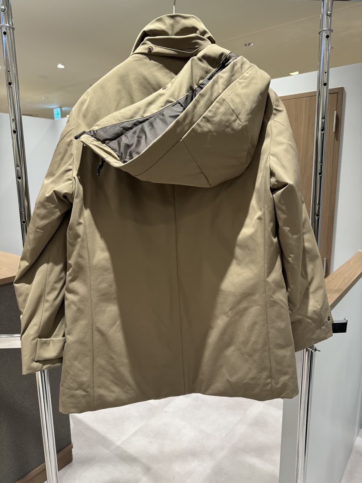 フードの付いたカジュアルベースながらも表のダウンキルトを隠したステッチレス仕様に、ボタンなども極力表に見えないようにデザインにし、上品さを演出。