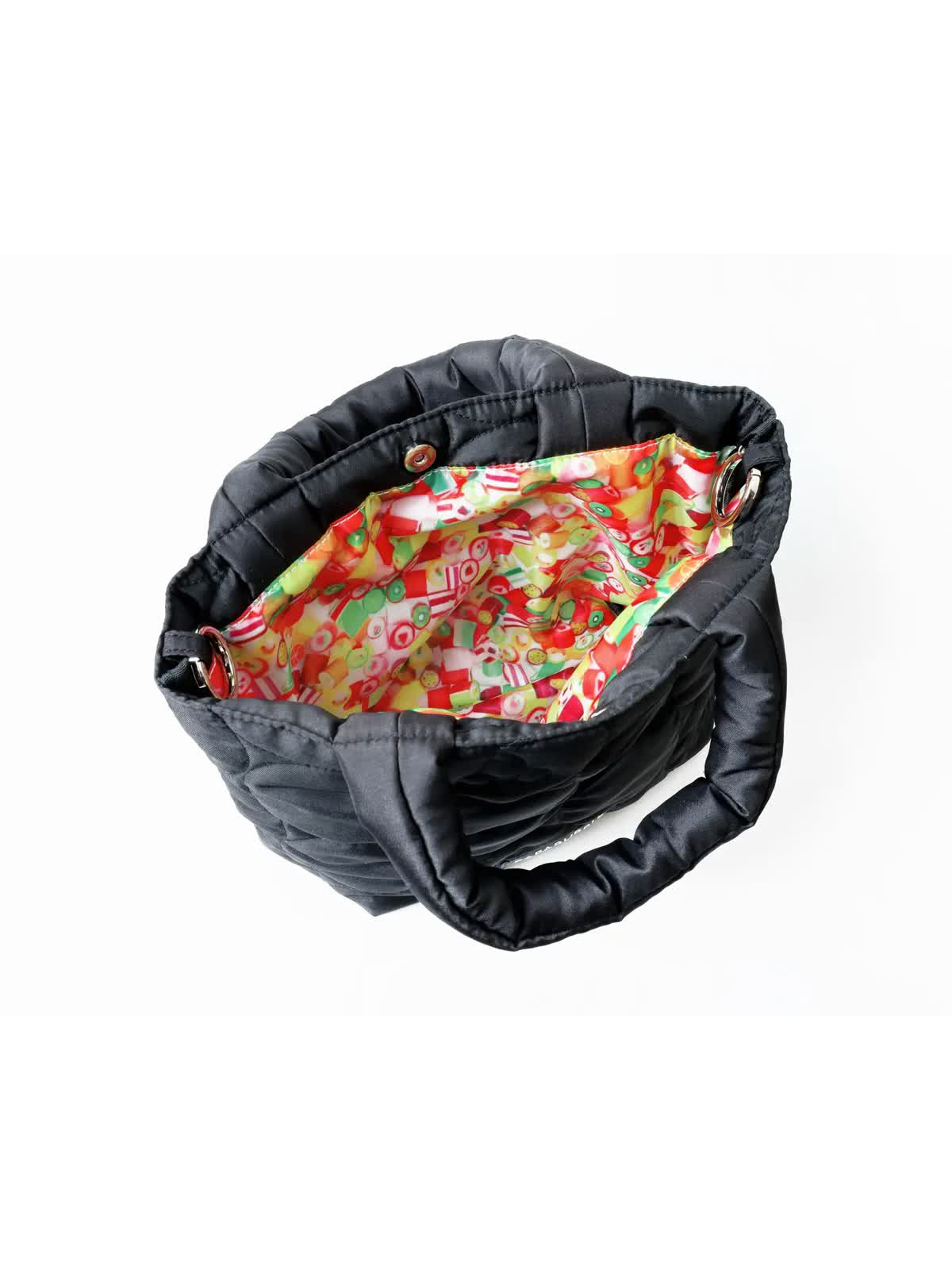 温かみのあるキルティング素材のバッグには、パパブブレの人気キャンディ柄「チェリー」をデザイン。裏地にはフルーツミックスをプリントした生地を使用しました。両端にカラビナを備え、お手持ちの紐をプラスすることで肩掛けタイプにもできる仕様です。シンプルながらもこだわりが詰まった、パパブブレらしいオリジナルアイテムとなっています。