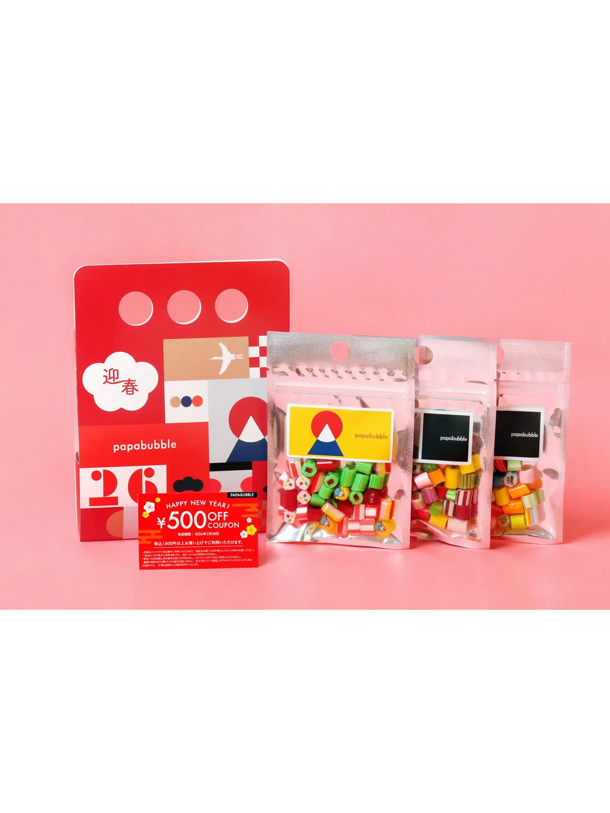 ・内容 :正月ミックス×1BAG、ランダムミックス×1BAG、フルーツミックス×1BAG、クーポン×1枚