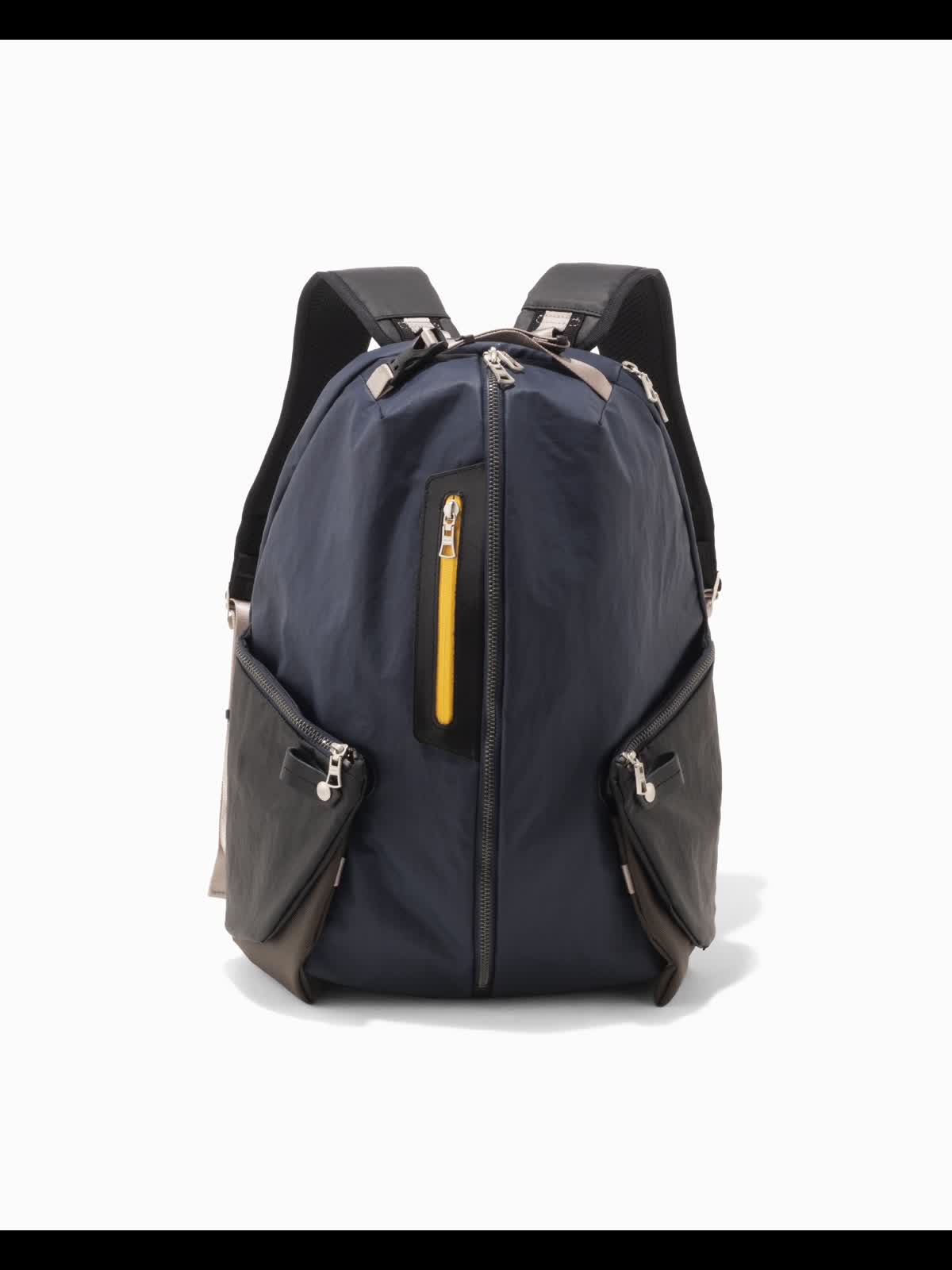 The front compartment, equipped with the series’ signature magnetic fastener, allows for smooth opening and closing, balancing both functionality and design. The use of waterproof zippers and yellow lining adds a bold accent to the overall look.