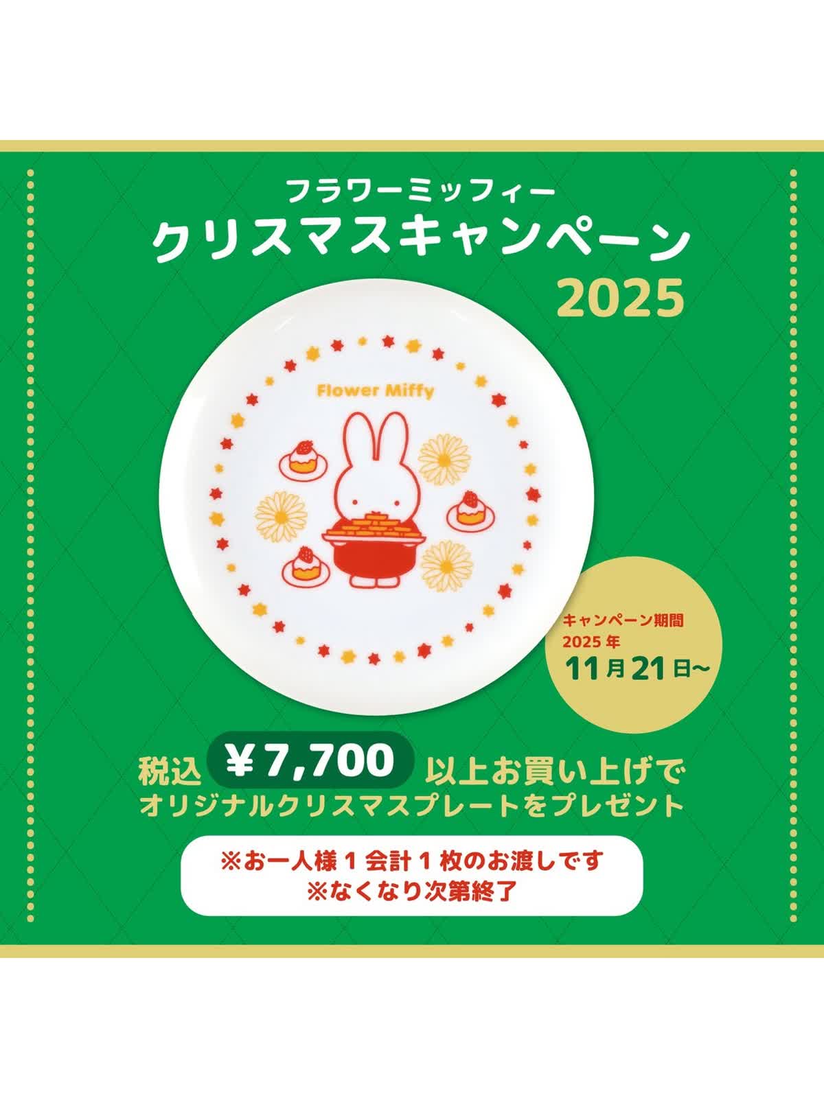 税込7,700円以上お買い上げいただいたお客様に、「フラワーミッフィーオリジナルプレート(非売品)」をプレゼント!
